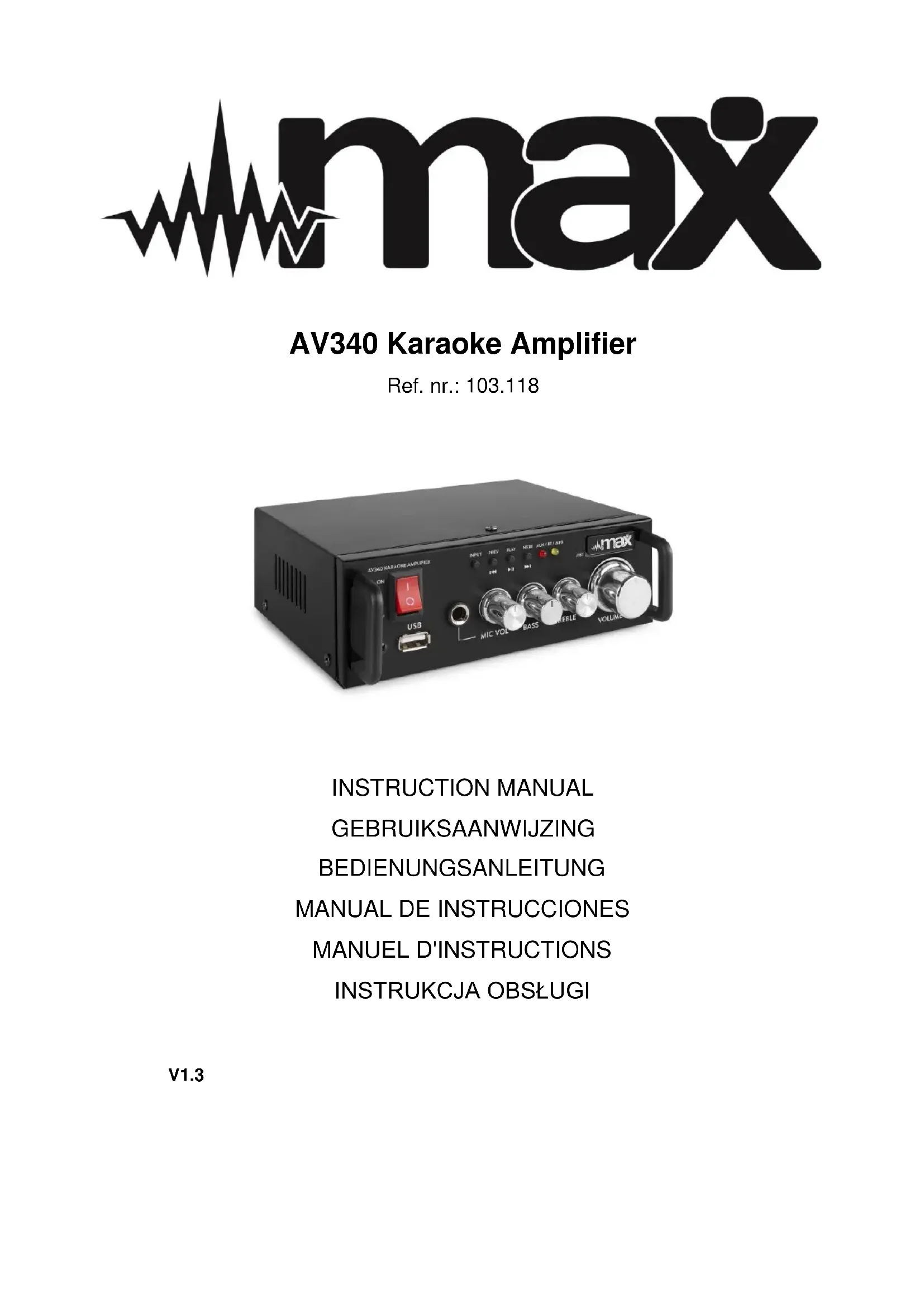 Primero encienda el amplificador, presione el botón "INPUT" hasta que el LED de BT se encienda. Luego use su móvil u otro dispositivo BT y busque el amplificador. Cuando encuentre "AV340", conéctese, no necesita contraseña. El amplificador sólo se descubre cuando se introduce el BT seleccionado.11 FRANÇAIS Nous vous remercions d’avoir acheté un produit Max. Veuillez lire la présente notice avant l’utilisation afin de pouvoir en profiter pleinement. Veuillez lire la notice avant toute utilisation. Respectez impérativement les instructions afin de continuer à bénéficier de la garantie. Prenez toutes les précautions nécessaires pour éviter tout incendie ou décharge électrique. Seul un technicien spécialisé peut effectuer les réparations. Nous vous conseillons de conserver la présente notice pour pouvoir vous y reporter ultérieurement. - Avant d’utiliser l’appareil, prenez conseil auprès d’un spécialiste. Lors de la première mise sous tension, il est possible qu’une odeur soit perceptible. C’est normal, l’odeur disparaîtra peu de temps après. - L’appareil contient des composants porteurs de tension. N’OUVREZ JAMAIS le boîtier. - Ne placez pas des objets métalliques ou du liquide sur l’appareil, cela pourrait causer des décharges électriques et dysfonctionnements.. - Ne placez pas l’appareil à proximité de sources de chaleur, par exemple radiateur. Ne positionnez pas l’appareil sur une surface vibrante. N’obturez pas les ouïes de ventilation. - L’appareil n’est pas conçu pour une utilisation en continu. - Faites attention au cordon secteur, il ne doit pas être endommagé. - Lorsque vous débranchez l’appareil de la prise secteur, tenez-le par la prise, ne tirez jamais sur le cordon. - Ne branchez pas et ne débranchez pas l’appareil avec les mains mouillées. - Seul un technicien spécialisé peut remplacer la fiche secteur et / ou le cordon secteur. - Si l’appareil est endommagé et donc les éléments internes sont visibles, ne branchez pas l’appareil, NE L’ALLUMEZ PAS. Contactez votre revendeur. NE BRANCHEZ PAS l’appareil à un rhéostat ou un dimmer. - Pour éviter tout risque d’incendie ou de décharge électrique, n’exposez pas l’appareil à la pluie ou à l’humidité. - Seul un technicien habilité et spécialisé peut effectuer les réparations - Branchez l’appareil à une prise secteur 220-240 Vac/50 Hz avec terre, avec un fusible 10-16 A. - Pendant un orage ou en cas de non utilisation prolongée de l’appareil, débranchez l’appareil du secteur. - En cas de non utilisation prolongée de l’appareil, de la condensation peut être créée. Avant de l’allumer, laissez l’appareil atteindre la température ambiante. Ne l’utilisez jamais dans des pièces humides ou en extérieur. - Afin d’éviter tout accident en entreprise, vous devez respecter les conseils et instructions. - N’allumez pas et n’éteignez pas l’appareil de manière répétée. Cela réduit sa durée de vie. - Conservez l’appareil hors de la portée des enfants. Ne laissez pas l’appareil sans surveillance. - N’utilisez pas d’aérosols pour nettoyer les interrupteurs. Les résidus créent des dépôts et de la graisse. En cas de dysfonctionnement, demandez conseil à un spécialiste. - Ne forcez pas les réglages. - L’appareil contient un haut-parleur pouvant engendrer des champs magnétiques. Tenez cet appareil à 60 cm au moins d’un téléviseur ou ordinateur. - Si le produit comprend un accumulateur intégré plomb- acide, rechargez l'accumulateur tous les 3 mois en cas de non utilisation prolongée de l'appareil. Sinon, l'accumulateur pourrait être endommagé de manière permanente. - Si l’accumulateur est endommagé, remplacez-le par un accumulateur de même type et déposez l’ancien accumulateur dans un container de recyclage adapté. - Si l’appareil est tombé, faites-le toujours vérifier par un technicien avant de le rallumer. - Pour nettoyer l’appareil, n’utilisez pas de produits chimiques qui abîment le revêtement, utilisez uniquement un tissu sec. - Tenez toujours l’appareil éloigné de tout équipement électrique pouvant causer des interférences. - Pour toute réparation, il faut impérativement utiliser des pièces d’origine, sinon il y a risque de dommages graves et / ou de radiations dangereuses. - Eteignez toujours l’appareil avant de le débrancher du secteur et de tout autre appareil. Débranchez tous les cordons avant de déplacer l’appareil. - Assurez-vous que le cordon secteur n’est pas abîmé si des personnes viennent à marcher dessus. Avant toute utilisation, vérifiez son état. - La tension d’alimentation est de 220-240Vac/50 Hz. Vérifiez la compatibilité. Si vous voyagez, vérifiez que la tension d’alimentation du pays est compatible avec l’appareil. - Conservez l’emballage d’origine pour pouvoir transporter l’appareil en toute sécurité. Ce symbole doit attirer l’attention de l’utilisateur sur les tensions élevées présentes dans le boîtier de l’appareil, pouvant engendrer une décharge électrique. Ce symbole doit attirer l’attention de l’utilisateur sur des instructions importantes détaillées dans la notice, elles doivent être lues et respectées. Cet appareil porte le symbole CE. Il est interdit d’effectuer toute modification sur l’appareil. La certification CE et la garantie deviendraient caduques ! NOTE: Pour un fonctionnement normal de l’appareil, il doit être utilisé en intérieur avec une plage de température maximale autorisée entre 5°C/41°F et 35°C/95°F. Ne jetez pas les produits électriques dans la poubelle domestique. Déposez-les dans une décharge. Demandez conseil aux autorisés ou à votre revendeur. Données techniques réservées. Les valeurs actuelles peuvent varier d’un produit à l’autre. Tout droit de modification réservé sans notification préalable. N’essayez pas de répare
