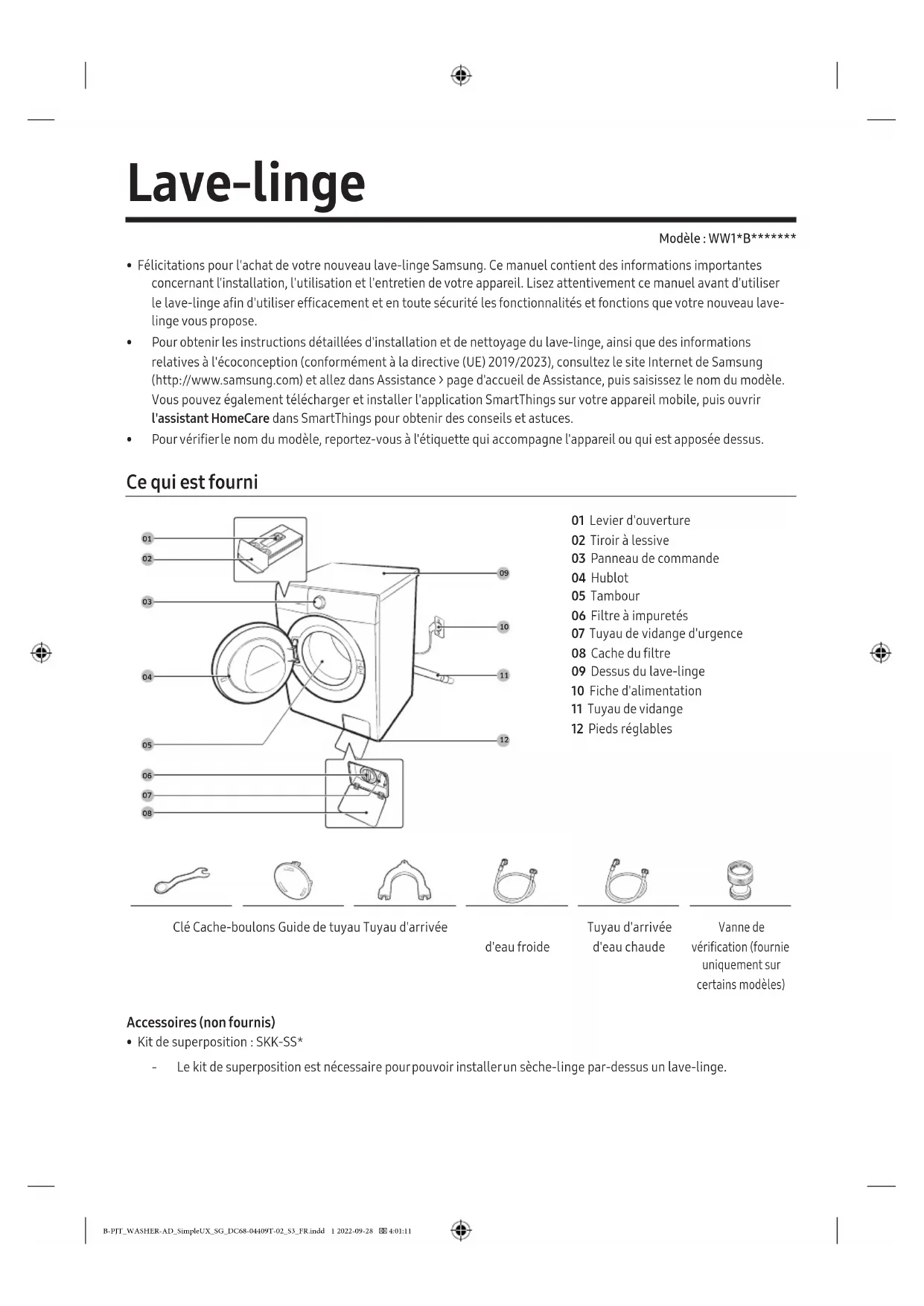 - Kit de superposition : SKK-SS* ‐ Le kit de superposition est nécessaire pour pouvoir installer un sèche-linge par-dessus un lave-linge. B-PJT_WASHER-AD_SimpleUX_SG_DC68-04409T-02_S3_FR.indd 1 2022-09-28 4:01:11Français2 Consignes de sécurité REMARQUE