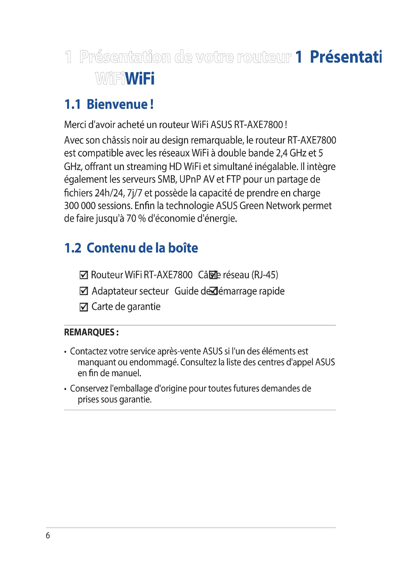 Routeur WiFi RT-AXE7800 Câble réseau (RJ-45) Adaptateur secteur Guide de démarrage rapide Carte de garantie REMARQUES :
