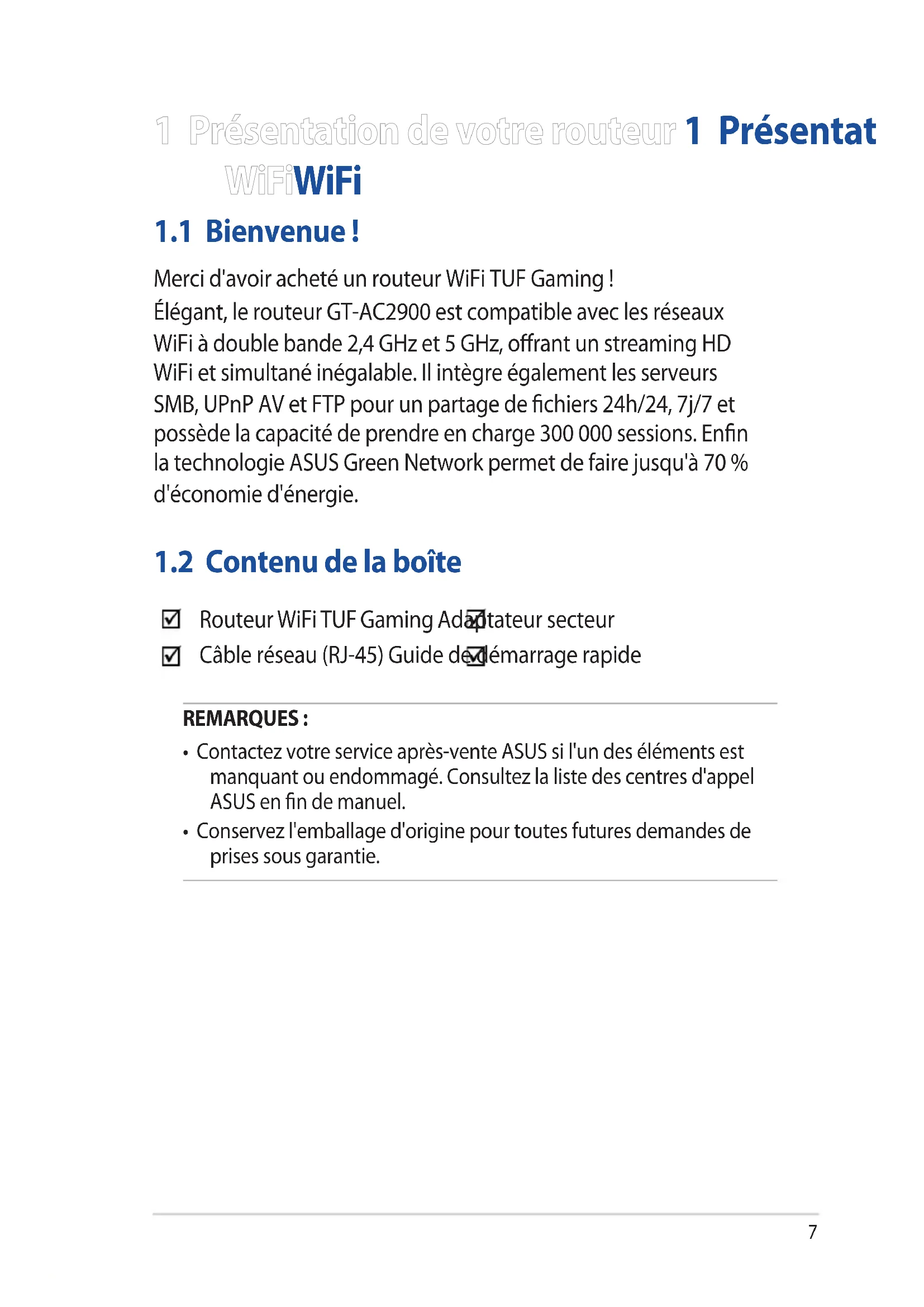 - Conservez l'emballage d'origine pour toutes futures demandes de prises sous garantie. Routeur WiFi TUF Gaming Adaptateur secteur Câble réseau (RJ-45) Guide de démarrage rapide8