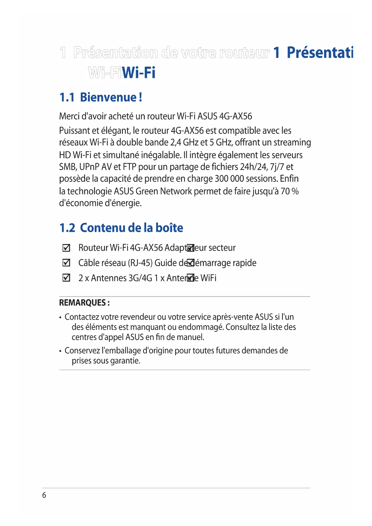 - Conservez l'emballage d'origine pour toutes futures demandes de prises sous garantie. Routeur Wi-Fi 4G-AX56 Adaptateur secteur Câble réseau (RJ-45) Guide de démarrage rapide 2 x Antennes 3G/4G 1 x Antenne WiFi7