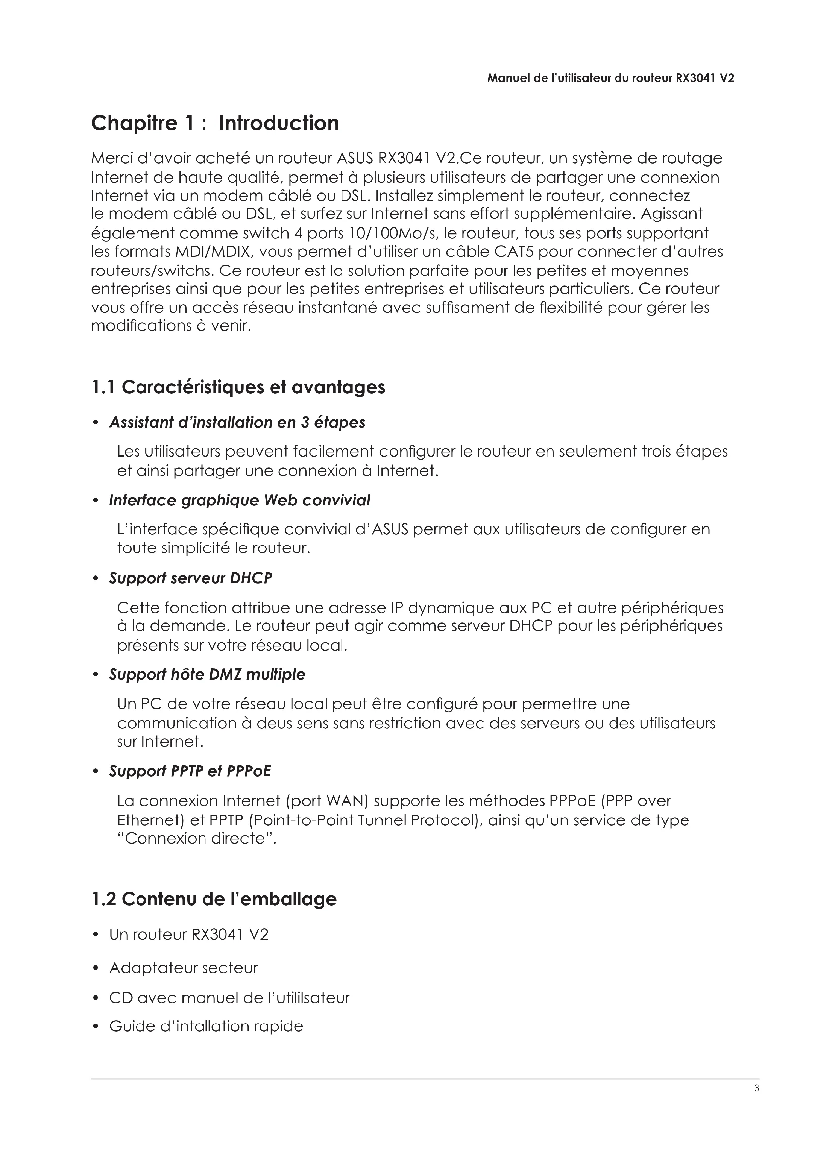 Merci d’avoir acheté un routeur ASUS RX3041 V2.Ce routeur, un système de routage Internet de haute qualité, permet à plusieurs utilisateurs de partager une connexion Internet via un modem câblé ou DSL. Installez simplement le routeur, connectez le modem câblé ou DSL, et surfez sur Internet sans effort supplémentaire. Agissant également comme switch 4 ports 10/100Mo/s, le routeur, tous ses ports supportant les formats MDI/MDIX, vous permet d’utiliser un câble CAT5 pour connecter d’autres routeurs/switchs. Ce routeur est la solution parfaite pour les petites et moyennes entreprises ainsi que pour les petites entreprises et utilisateurs particuliers. Ce routeur vous offre un accès réseau instantané avec sufsament de exibilité pour gérer les modications à venir.