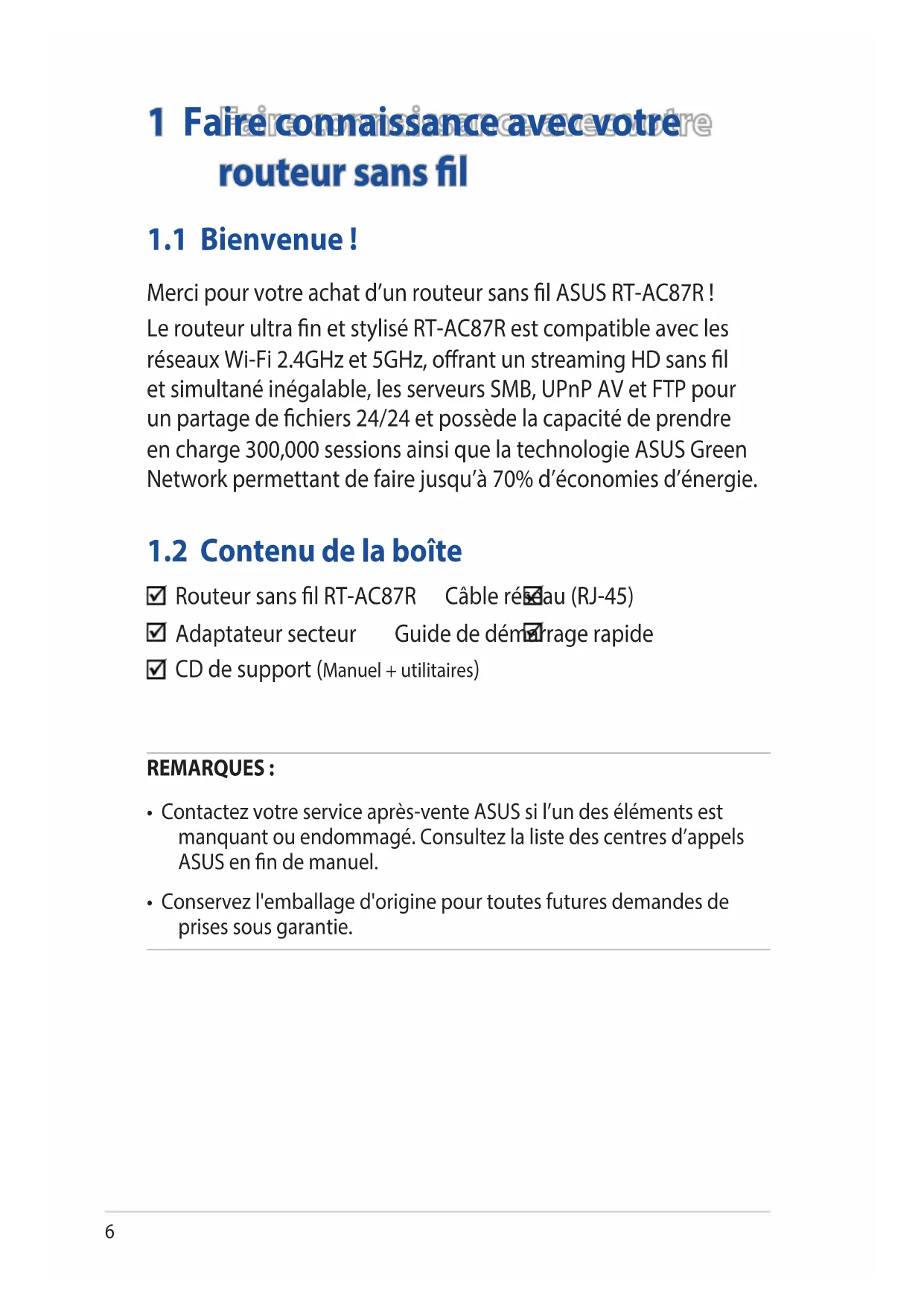 - Conservez l'emballage d'origine pour toutes futures demandes de prises sous garantie. Routeur sans l RT-AC87R Câble réseau (RJ-45) Adaptateur secteur Guide de démarrage rapide CD de support (Manuel + utilitaires)