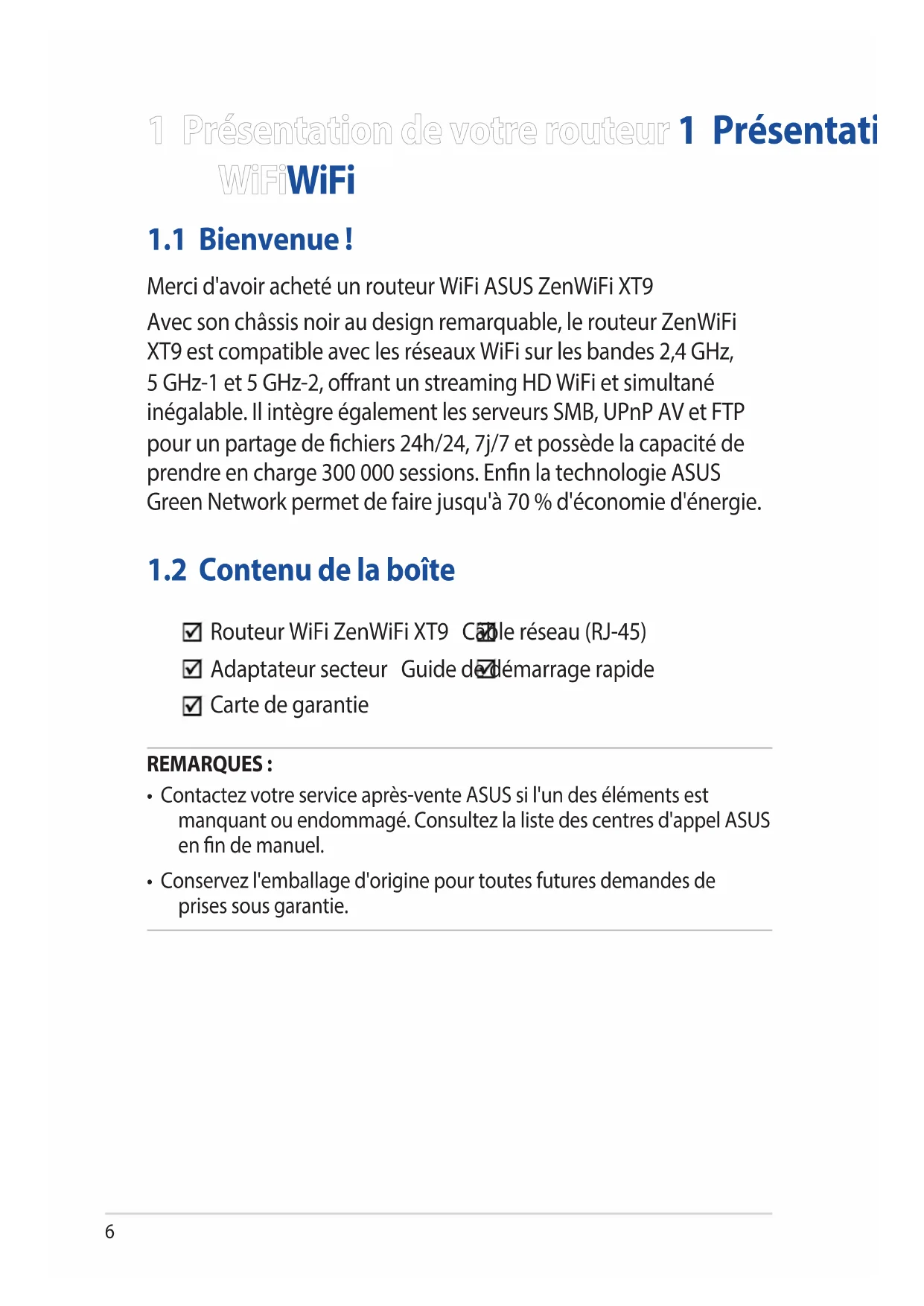 Routeur WiFi ZenWiFi XT9 Câble réseau (RJ-45) Adaptateur secteur Guide de démarrage rapide Carte de garantie REMARQUES :