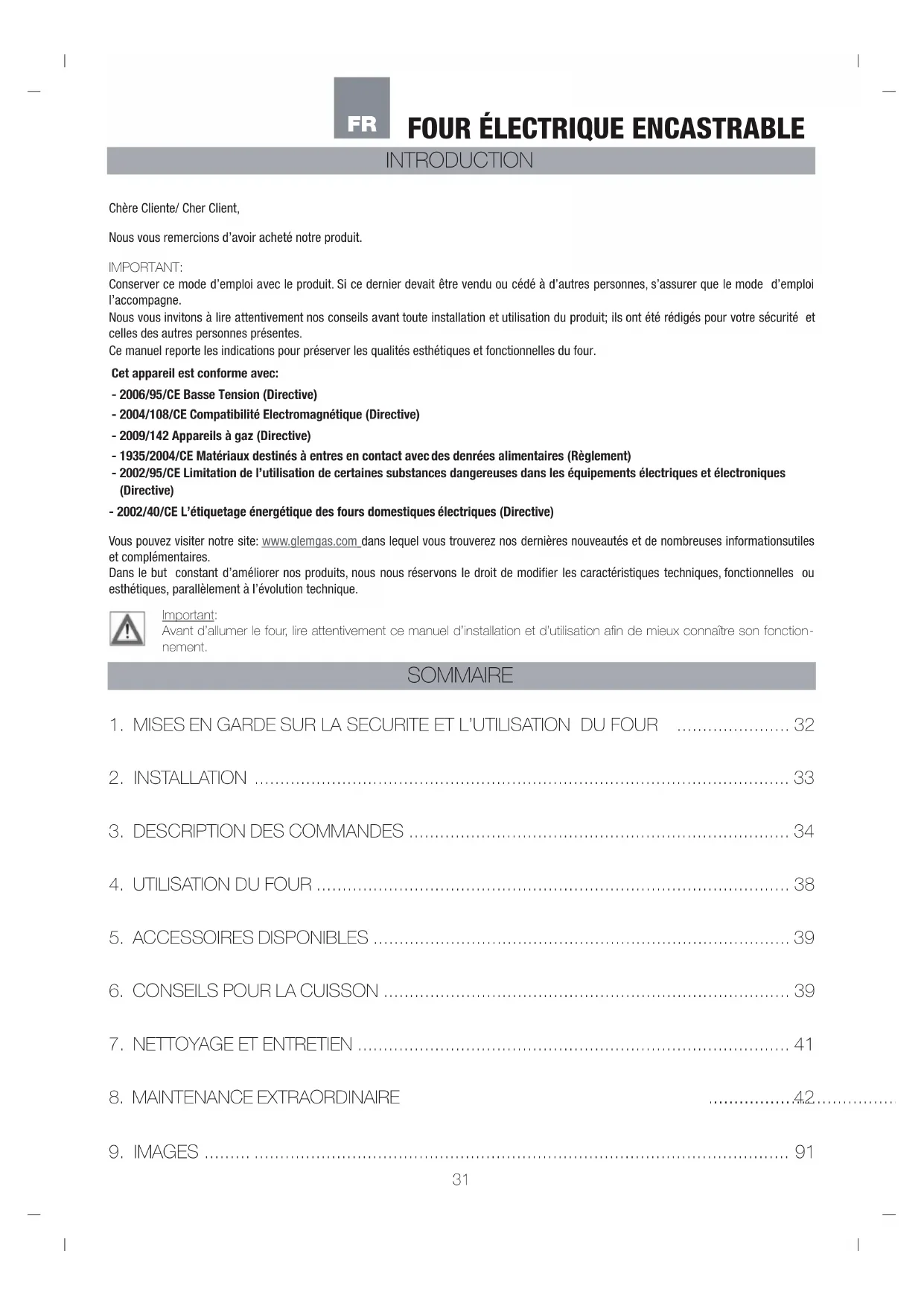 Cet appareil est conforme avec:- 2006/95/CE Basse Tension (Directive)- 2004/108/CE Compatibilité Electromagnétique (Directive)- 2009/142 Appareils à gaz (Directive)- 1935/2004/CE Matériaux destinés à entres en contact avec des denrées alimentaires (Règlement)- 2002/95/CE Limitation de l’utilisation de certaines substances dangereuses dans les équipements électriques et électroniques (Directive)- 2002/40/CE L’étiquetage énergétique des fours domestiques électriques (Directive)32 INSTRUCTIONS POUR L’INSTALLATEUR: Elles indiquent les opérations destinées au TECHNICIEN QUALIFIE qui doit effectuer l’installation, la mise en service et l’essai de l’appareil. INSTRUCTIONS POUR L’UTILISATEUR: Elles indiquent les conseils d’utilisation, la description des commandes et les opérations de nettoyage et de maintenance du four.