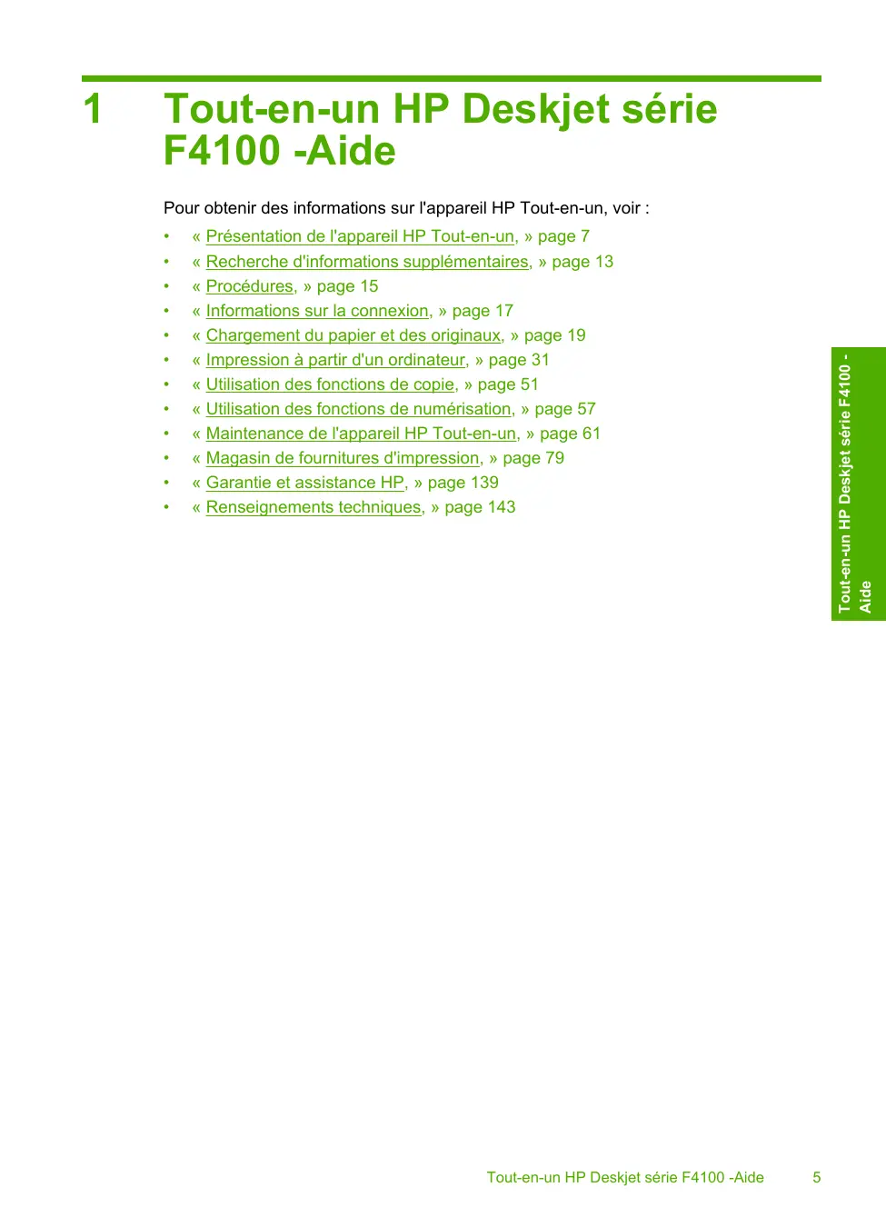 « Présentation de l'appareil HP Tout-en-un, » page 7 « Recherche d'informations supplémentaires, » page 13 « Procédures, » page 15 « Informations sur la connexion, » page 17 « Chargement du papier et des originaux, » page 19 « Impression à partir d'un ordinateur, » page 31 « Utilisation des fonctions de copie, » page 51 « Utilisation des fonctions de numérisation, » page 57 « Maintenance de l'appareil HP Tout-en-un, » page 61 « Magasin de fournitures d'impression, » page 79 « Garantie et assistance HP, » page 139 « Renseignements techniques, » page 143 Tout-en-un HP Deskjet série F4100 -Aide Tout-en-un HP Deskjet série F4100 Aide