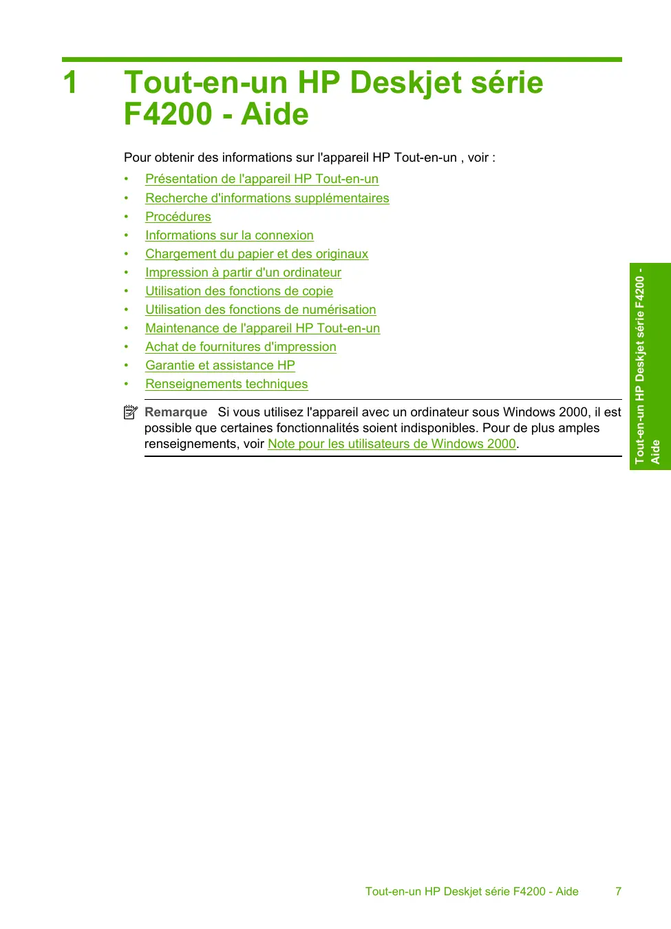 Présentation de l'appareil HP Tout-en-un Recherche d'informations supplémentaires Procédures Informations sur la connexion Chargement du papier et des originaux Impression à partir d'un ordinateur Utilisation des fonctions de copie Utilisation des fonctions de numérisation Maintenance de l'appareil HP Tout-en-un Achat de fournitures d'impression Garantie et assistance HP Renseignements techniques Remarque Si vous utilisez l'appareil avec un ordinateur sous Windows 2000, il est possible que certaines fonctionnalités soient indisponibles. Pour de plus amples renseignements, voir Note pour les utilisateurs de Windows 2000. Tout-en-un HP Deskjet série F4200 - Aide