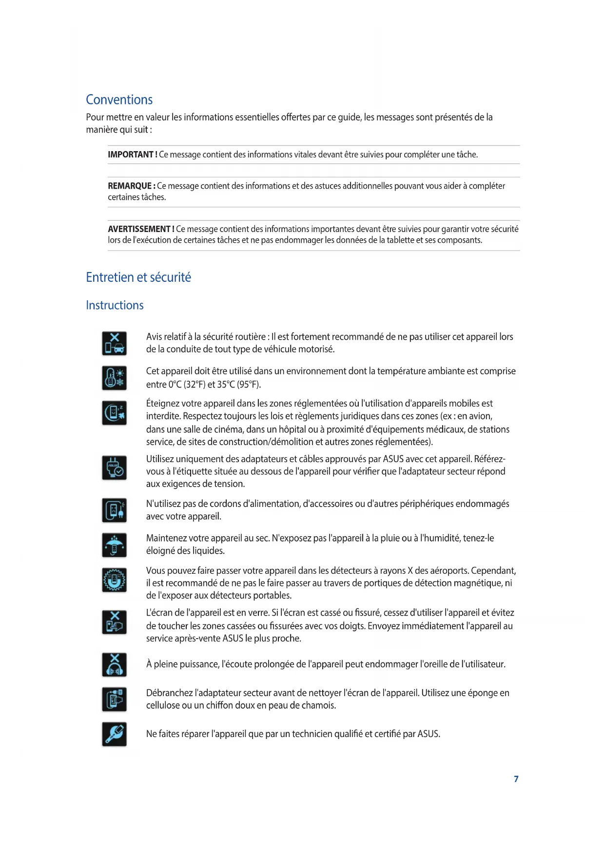 Notice relative au revêtement de l'appareil IMPORTANT ! Pour maintenir le niveau de sécurité électrique et fournir une meilleure isolation, un revêtement a été appliqué pour isoler le châssis de cet appareil. Veuillez toutefois noter que les zones de l'appareil où se trouvent les diérentes interfaces de connexion ne disposent pas de ce revêtement spécial. Précautions relatives à la sécurité Votre tablette ASUS doit être utilisée dans un environnement dont la température ambiante est comprise entre 0°C et 35°C. L’exposition de l’appareil à des températures trop élevées ou trop basses peut rapidement épuiser et réduire la durée de vie de la batterie.Appendice