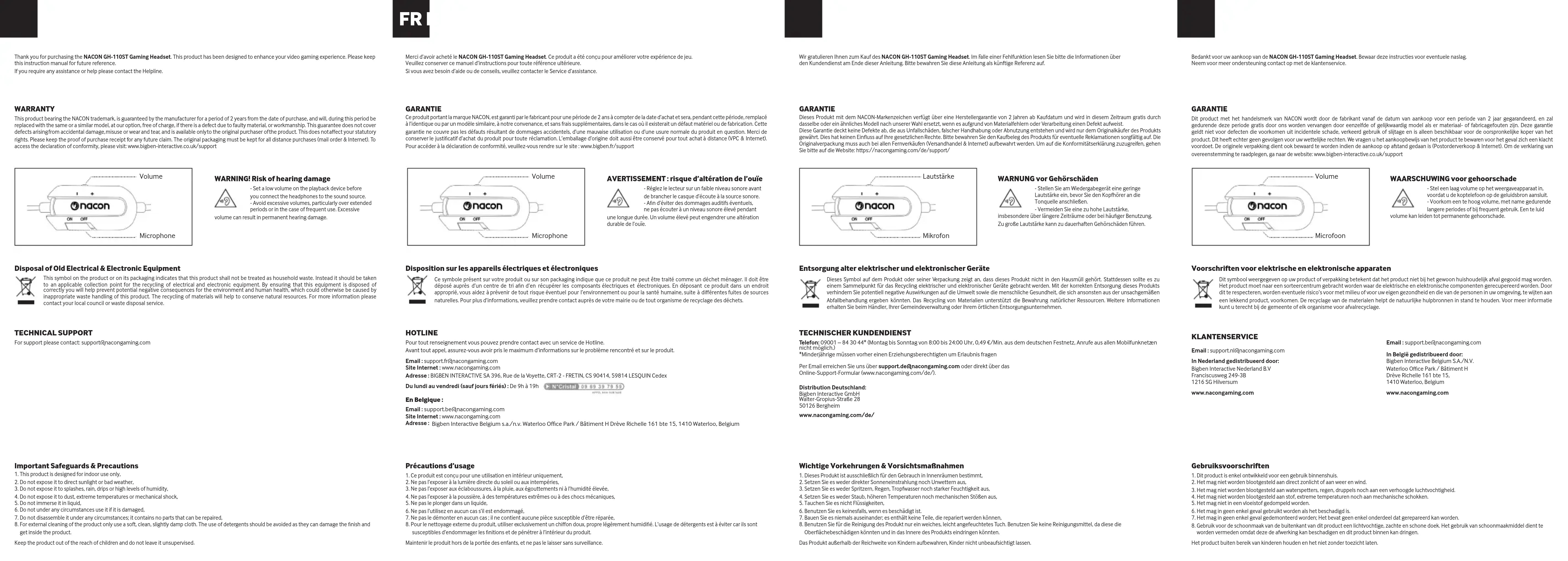 HOTLINE Pour tout renseignement vous pouvez prendre contact avec un service de Hotline.Avant tout appel, assurez-vous avoir pris le maximum d’informations sur le problème rencontré et sur le produit.Email : support.fr@nacongaming.comSite Internet : www.nacongaming.com Adresse : BIGBEN INTERACTIVE SA 396, Rue de la Voyette, CRT-2 - FRETIN, CS 90414, 59814 LESQUIN Cedex Du lundi au vendredi (sauf jours fériés) : De 9h à 19h