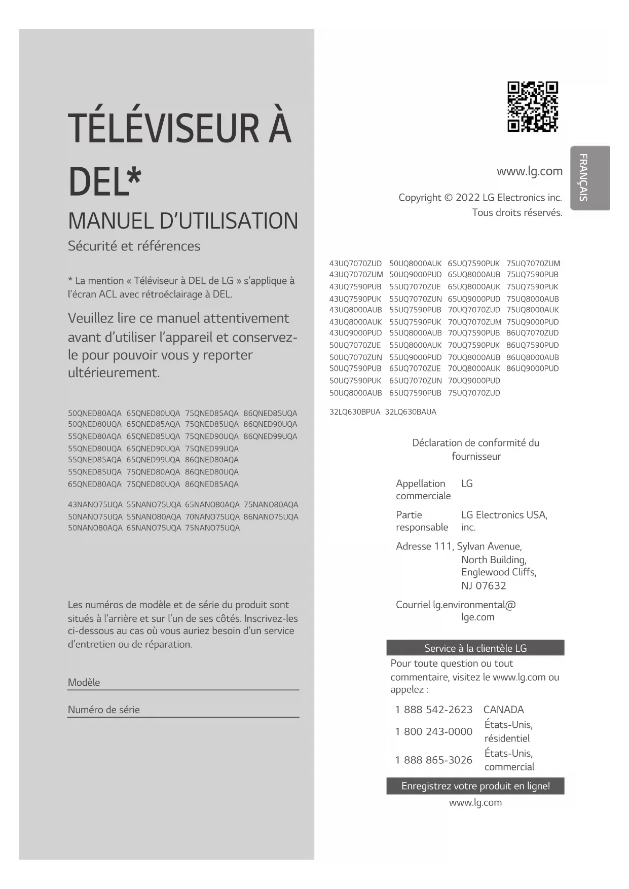 Partie responsable LG Electronics USA, inc. Adresse 111, Sylvan Avenue, North Building, Englewood Cliffs, NJ07632 Courriel lg.environmental@ lge.com Service à la clientèle LG Pour toute question ou tout commentaire, visitez le www.lg.com ou appelez : 1888542-2623 CANADA 1800243-0000 États-Unis, résidentiel 1888865-3026 États-Unis, commercial Enregistrez votre produit en ligne! www.lg.com2 Directives de sécurité importantes