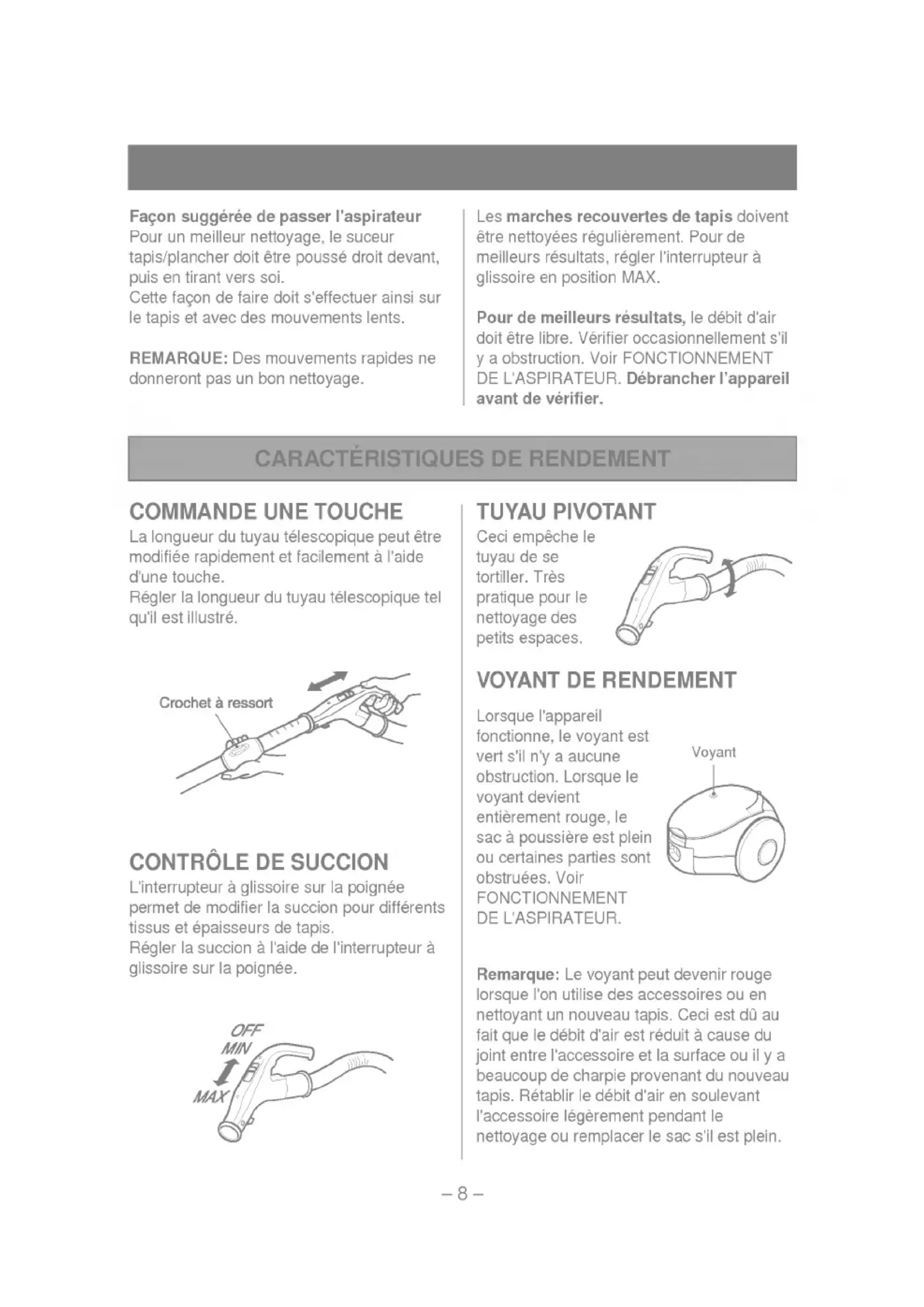 SUCCION L'interrupteur glissoire surla poignee permet demodifierlasuccionpourdifferentstissuset epaisseurs tapis. Regler lasuccional'aidede l'interrupteur glissoire surla poignee. TUYAU PIVOTANT Ceci empeche tuyau desetortiller.Tres pratique pourle nettoyage des petits espaces. VOYANT