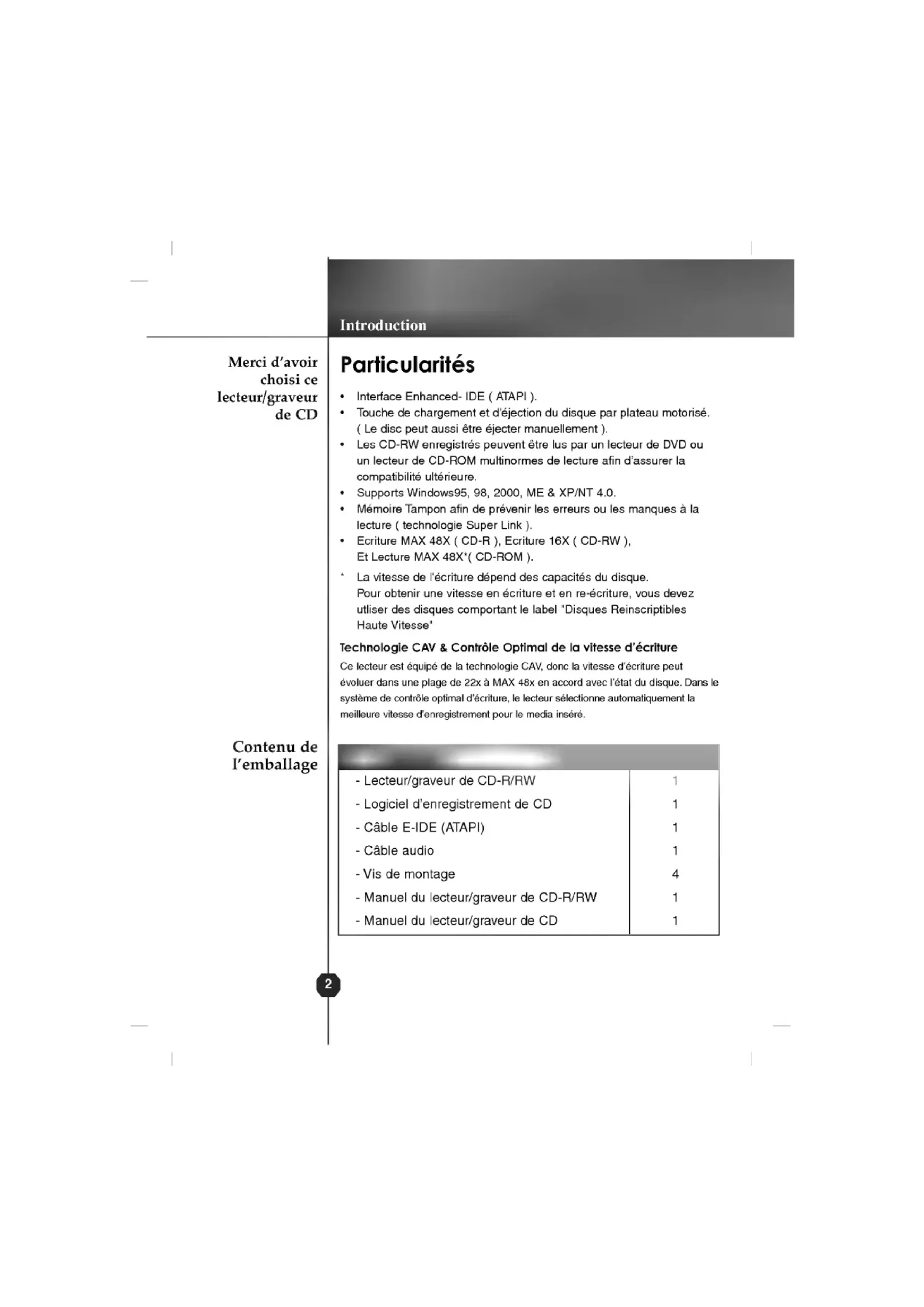 re-ecriture, vous devezutliserdesdisques comportant lelabel"DisquesReinscriptiblesHauteVitesse" Technologie CAV&ControleOptimaldelavitessed'ecritureCelecteurestequipedelatechnologieCAV,donclavitessed'ecriturepeutevoluerdansuneplagede22xaMAX48xenaccordavecl'etatdudisque.Danslesystemedecontroleoptimald'ecriture,lelecteurselectionneautomatiquementlameilleurevitessed'enregistrementpourlemediainsere. Article Quantite- Lecteur/graveur deCD-R/RW1- Logiciel d'enregistrement deCD1- Cable E-IDE (ATAPI) Cable audio1-Visdemontage4-Manueldu lecteur/graveur deCD-R/RW1-Manueldu lecteur/graveur deCD1Precautions Installation Fonctionnement Precautions importantes Lesinstructionsci-dessousdoiventetreobserveeslorsdetoute manipu- lationdu lecteur/graveur commedes disques. ?Lefabricantdu present equipement declinetoute responsabilite encasdepertededonneesoude dommages directsouindirects imputables auneinstallationouaune manipulation non appropriee. ?Lefabricantdeclinetoute responsabilite encasde dommages directsouindirectsdus al'utilisationouaunmauvaisfonctionnementdu present produit. ?Etablissezune copie sauvegarde detouteslesdonnees impor- tantesafindene risquer aucuneperte.?Eviterles emplacements soumisauxcontraintessuivantes