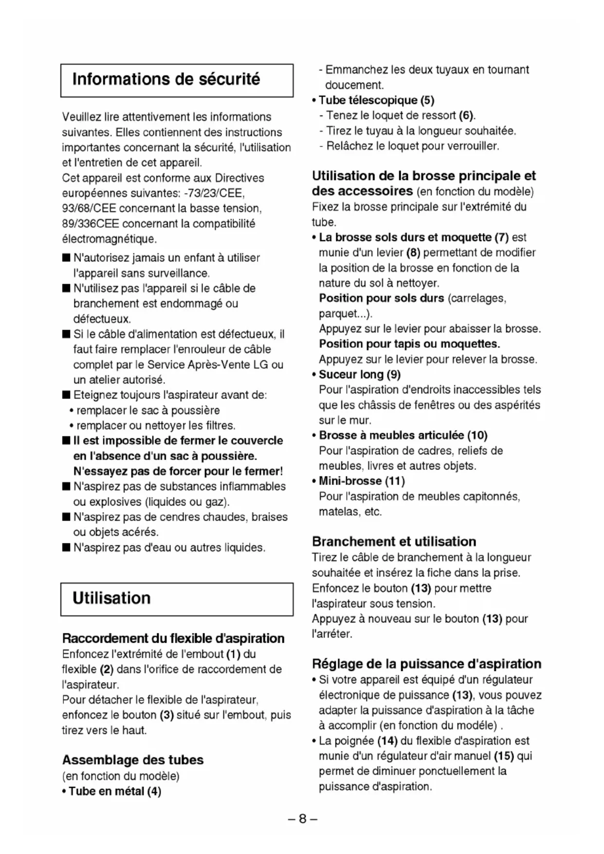 des accessoires (en fonctiondu modele) Fixezlabrosse principale surl'extremitedutube.?Labrossesolsdurset moquette (7) estmunied'unlevier (8) permettant demodifierla position delabrosseenfonctiondelanaturedusola nettoyer. Positionpoursolsdurs (carrelages, parquet...). Appuyez surlelevierpourabaisserlabrosse.Positionpour tapis moquettes. Appuyez surlelevierpourreleverlabrosse.?Suceur long (9) Pour l'aspiration d'endroitsinaccessiblestelsqueleschassisdefenetresoudes asperites surlemur.?Brosse meubles articulee (10) Pour l'aspiration cadres, reliefsde meubles, livresetautres objets. ?Mini-brosse (11) Pour l'aspiration demeubles capitonnes, matelas, etc. Branchement