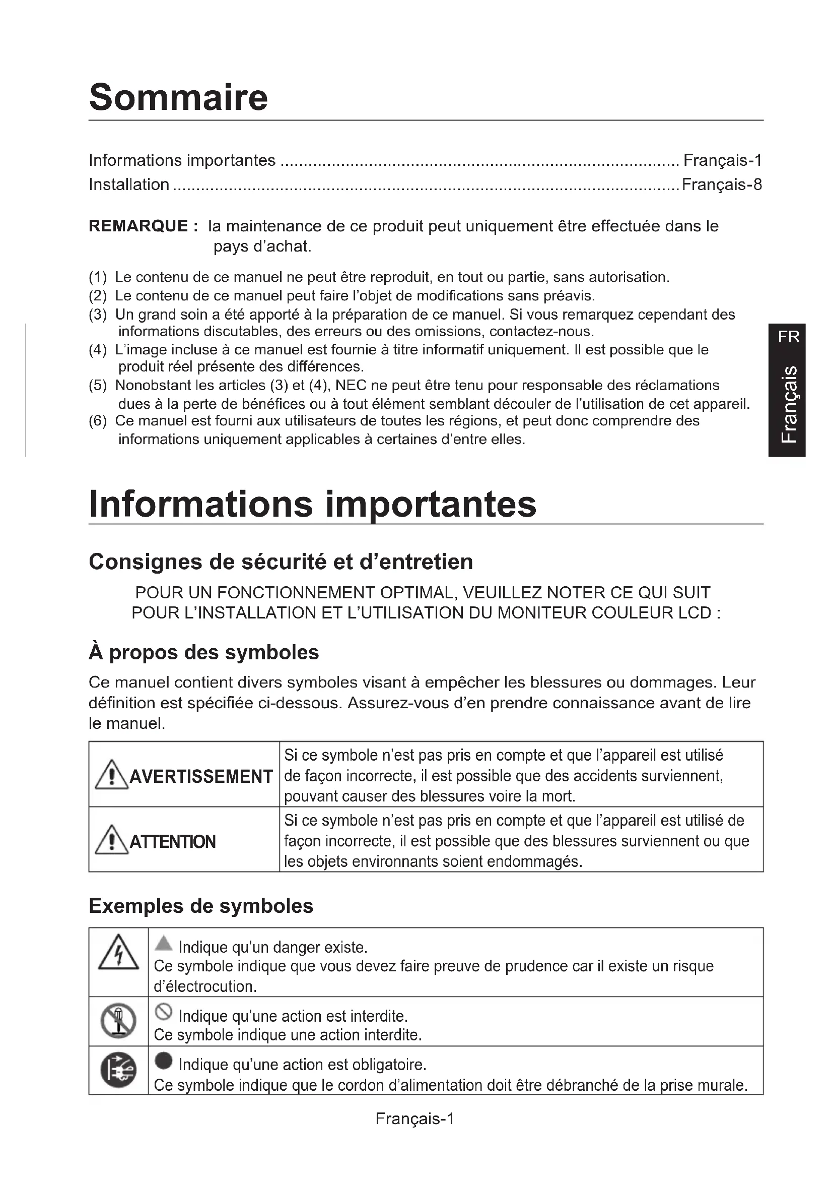Français Informations importantes ...................................................................................... Français-1 Installation .............................................................................................................Français-8 Sommaire REMARQUE : la maintenance de ce produit peut uniquement être effectuée dans le pays d’achat. (1) Le contenu de ce manuel ne peut être reproduit, en tout ou partie, sans autorisation.(2) Le contenu de ce manuel peut faire l’objet de modications sans préavis.(3) Un grand soin a été apporté à la préparation de ce manuel. Si vous remarquez cependant des informations discutables, des erreurs ou des omissions, contactez-nous.(4) L’image incluse à ce manuel est fournie à titre informatif uniquement. Il est possible que le produit réel présente des différences.(5) Nonobstant les articles (3) et (4), NEC ne peut être tenu pour responsable des réclamations dues à la perte de bénéces ou à tout élément semblant découler de l’utilisation de cet appareil.(6) Ce manuel est fourni aux utilisateurs de toutes les régions, et peut donc comprendre des informations uniquement applicables à certaines d’entre elles. Informations importantes Consignes de sécurité et d’entretien POUR UN FONCTIONNEMENT OPTIMAL, VEUILLEZ NOTER CE QUI SUIT POUR L’INSTALLATION ET L’UTILISATION DU MONITEUR COULEUR LCD : À propos des symboles Ce manuel contient divers symboles visant à empêcher les blessures ou dommages. Leur dénition est spéciée ci-dessous. Assurez-vous d’en prendre connaissance avant de lire le manuel. AVERTISSEMENT Si ce symbole n’est pas pris en compte et que l’appareil est utilisé de façon incorrecte, il est possible que des accidents surviennent, pouvant causer des blessures voire la mort. ATTENTION Si ce symbole n’est pas pris en compte et que l’appareil est utilisé de façon incorrecte, il est possible que des blessures surviennent ou que les objets environnants soient endommagés. Exemples de symboles Indique qu’un danger existe. Ce symbole indique que vous devez faire preuve de prudence car il existe un risque d’électrocution. Indique qu’une action est interdite. Ce symbole indique une action interdite. Indique qu’une action est obligatoire. Ce symbole indique que le cordon d’alimentation doit être débranché de la prise murale.Français-2 AVERTISSEMENT