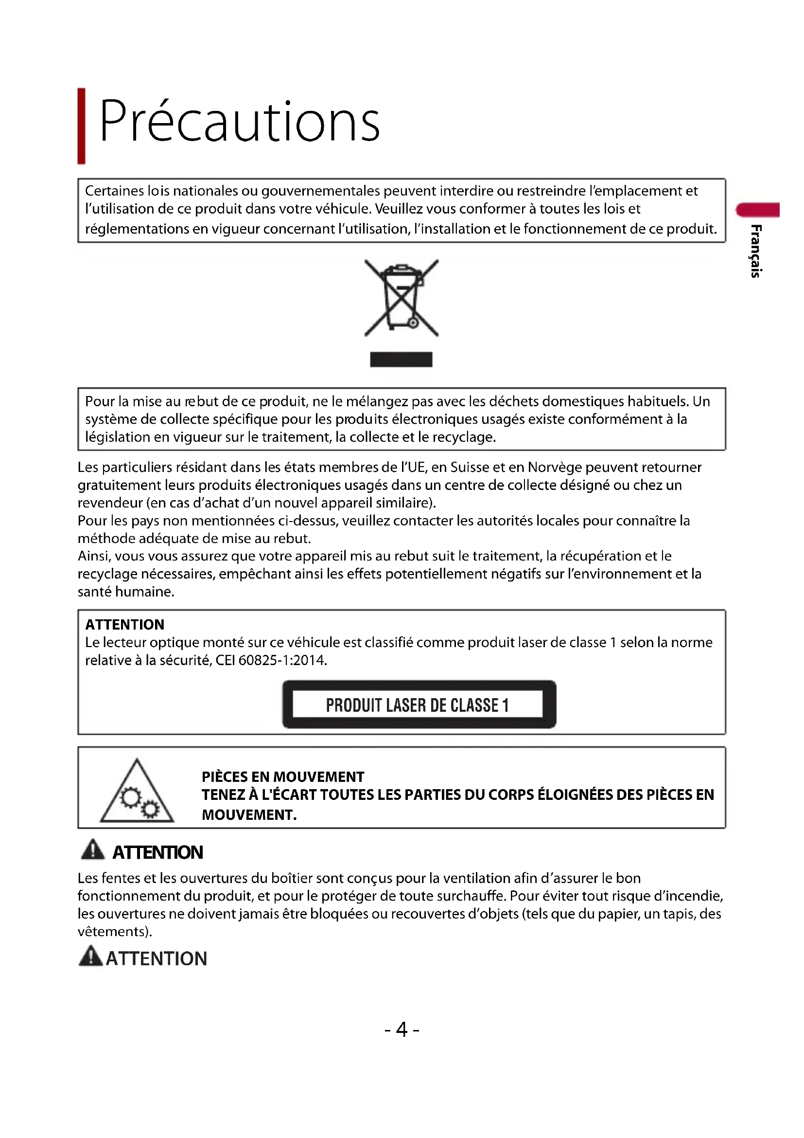 - ■Annexe - 4 - Français Les particuliers résidant dans les états membres de l’UE, en Suisse et en Norvège peuvent retourner gratuitement leurs produits électroniques usagés dans un centre de collecte désigné ou chez un revendeur (en cas d’achat d’un nouvel appareil similaire). Pour les pays non mentionnées ci-dessus, veuillez contacter les autorités locales pour connaître la méthode adéquate de mise au rebut.Ainsi, vous vous assurez que votre appareil mis au rebut suit le traitement, la récupération et le recyclage nécessaires, empêchant ainsi les effets potentiellement négatifs sur l’environnement et la santé humaine. ATTENTION Les fentes et les ouvertures du boîtier sont conçus pour la ventilation afin d’assurer le bon fonctionnement du produit, et pour le protéger de toute surchauffe. Pour éviter tout risque d’incendie, les ouvertures ne doivent jamais être bloquées ou recouvertes d’objets (tels que du papier, un tapis, des vêtements). Précautions Certaines lois nationales ou gouvernementales peuvent interdire ou restreindre l’emplacement et l’utilisation de ce produit dans votre véhicule. Veuillez vous conformer à toutes les lois et réglementations en vigueur concernant l’utilisation, l’installation et le fonctionnement de ce produit. Pour la mise au rebut de ce produit, ne le mélangez pas avec les déchets domestiques habituels. Un système de collecte spécifique pour les produits électroniques usagés existe conformément à la législation en vigueur sur le traitement, la collecte et le recyclage.ATTENTION Le lecteur optique monté sur ce véhicule est classifié comme produit laser de classe 1 selon la norme relative à la sécurité, CEI 60825-1:2014.PIÈCES EN MOUVEMENTTENEZ À L'ÉCART TOUTES LES PARTIES DU CORPS ÉLOIGNÉES DES PIÈCES EN MOUVEMENT. p. 100
