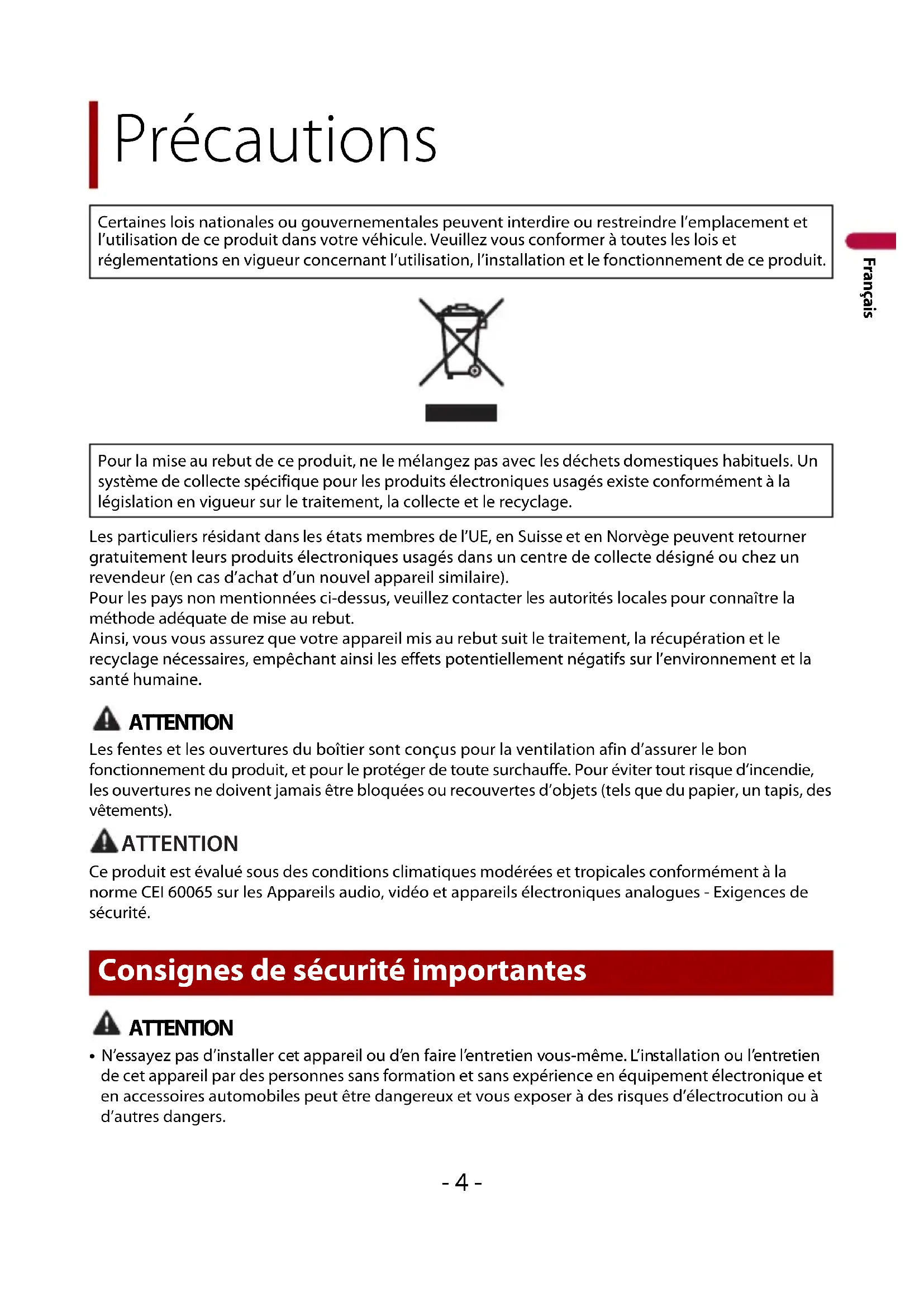 - N’essayez pas d’installer cet appareil ou d’en faire l’entretien vous-même. L’installation ou l’entretien de cet appareil par des personnes sans formation et sans expérience en équipement électronique et en accessoires automobiles peut être dangereux et vous exposer à des risques d’électrocution ou à d’autres dangers. Précautions Certaines lois nationales ou gouvernementales peuvent interdire ou restreindre l’emplacement et l’utilisation de ce produit dans votre véhicule. Veuillez vous conformer à toutes les lois et réglementations en vigueur concernant l’utilisation, l’installation et le fonctionnement de ce produit. Pour la mise au rebut de ce produit, ne le mélangez pas avec les déchets domestiques habituels. Un système de collecte spécifique pour les produits électroniques usagés existe conformément à la législation en vigueur sur le traitement, la collecte et le recyclage. Consignes de sécurité importantes ATTENTIONFrançais