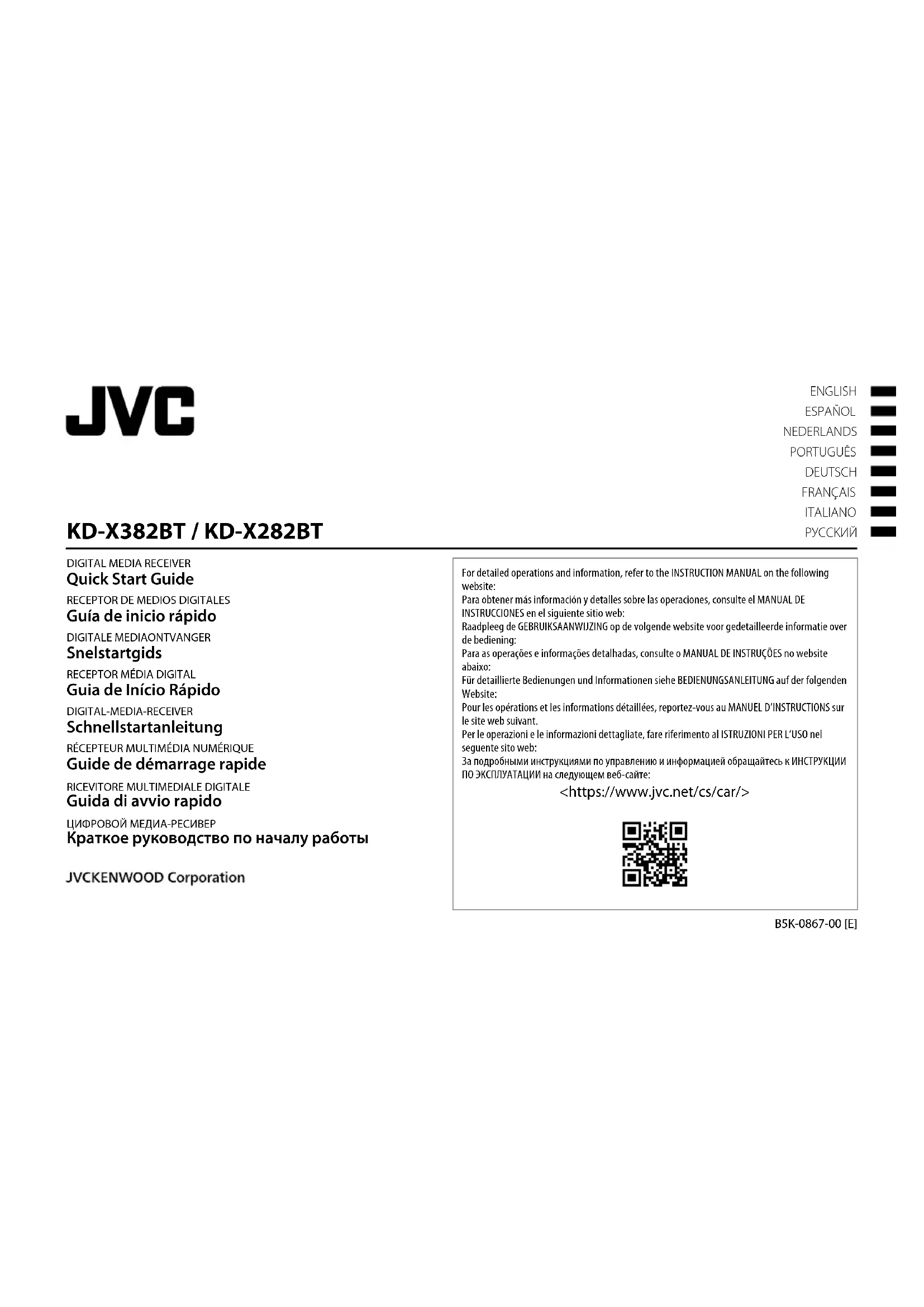 : Sélectionne la langue pour le menu et les informations sur le morceau. [ESPANOL] : Sélectionne la langue pour le menu et les informations sur le morceau. [FRANCAIS] : Sélectionne la langue pour le menu et les informations sur le morceau. [DEUTSCH] *2 : Sélectionne la langue pour le menu et les informations sur le morceau. [DEMO MODE] : Met en ou hors service la démonstration des affichages. *1 Utilisable uniquement pendant que vous parlez au téléphone. *2 Uniquement pour KD-X382BT. KD-X382BT_E_B5K-0867-00_FR.indd 6KD-X382BT_E_B5K-0867-00_FR.indd 6 2022/04/01 19:39:212022/04/01 19:39:217 Data Size: B6L (182 mm x 128 mm)Book Size: B6L (182 mm x 128 mm) Autres informations Pour les opérations de lecture de la source AUX, reportez-vous au MANUEL D’INSTRUCTIONS sur le site web suivant: <https://www.jvc.net/cs/car/>.• La disponibilité de chaque source varie en fonction du modèle.Remarque pour les spécificationsPlage de fréquences Bluetooth: Impédance d’enceinte: 2,402 GHz — 2,480 GHz 4 Ω — 8 ΩPuissance de sortie RF Bluetooth (E.I.R.P.): Tension de fonctionnement: +4 dBm (MAX), Classe d’alimentation 2 Batterie de voiture 12 V CC Bluetooth®