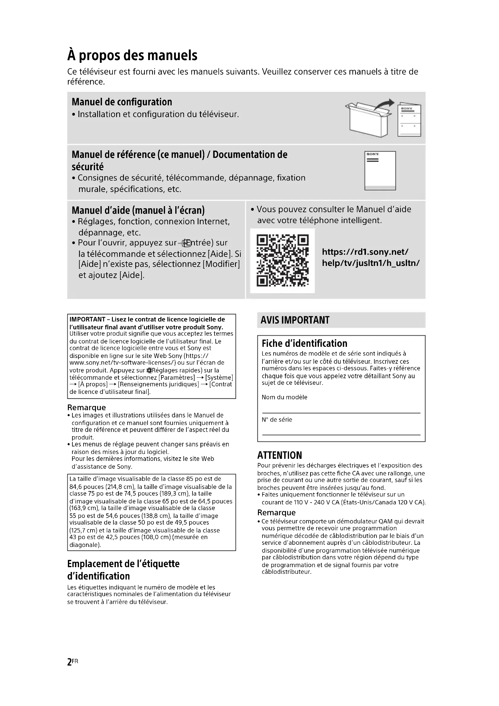 - Vous pouvez consulter le Manuel d’aide avec votre téléphone intelligent. https://rd1.sony.net/ help/tv/jusltn1/h_usltn/ IMPORTANT – Lisez le contrat de licence logicielle de l’utilisateur final avant d’utiliser votre produit Sony. Utiliser votre produit signifie que vous acceptez les termes du contrat de licence logicielle de l’utilisateur final. Le contrat de licence logicielle entre vous et Sony est disponible en ligne sur le site Web Sony (https:// www.sony.net/tv-software-licenses/) ou sur l’écran de votre produit. Appuyez sur (Réglages rapides) sur la télécommande et sélectionnez [Paramètres] [Système] [À propos] [Renseignements juridiques] [Contrat de licence d’utilisateur final]. La taille d’image visualisable de la classe 85 po est de 84,6 pouces (214,8 cm), la taille d’image visualisable de la classe 75 po est de 74,5 pouces (189,3 cm), la taille d’image visualisable de la classe 65 po est de 64,5 pouces (163,9 cm), la taille d’image visualisable de la classe 55 po est de 54,6 pouces (138,8 cm), la taille d’image visualisable de la classe 50 po est de 49,5 pouces (125,7 cm) et la taille d’image visualisable de la classe 43 po est de 42,5 pouces (108,0 cm) (mesurée en diagonale). AVIS IMPORTANT Fiche d’identification Les numéros de modèle et de série sont indiqués à l’arrière et/ou sur le côté du téléviseur. Inscrivez ces numéros dans les espaces ci-dessous. Faites-y référence chaque fois que vous appelez votre détaillant Sony au sujet de ce téléviseur. Nom du modèle N° de série3