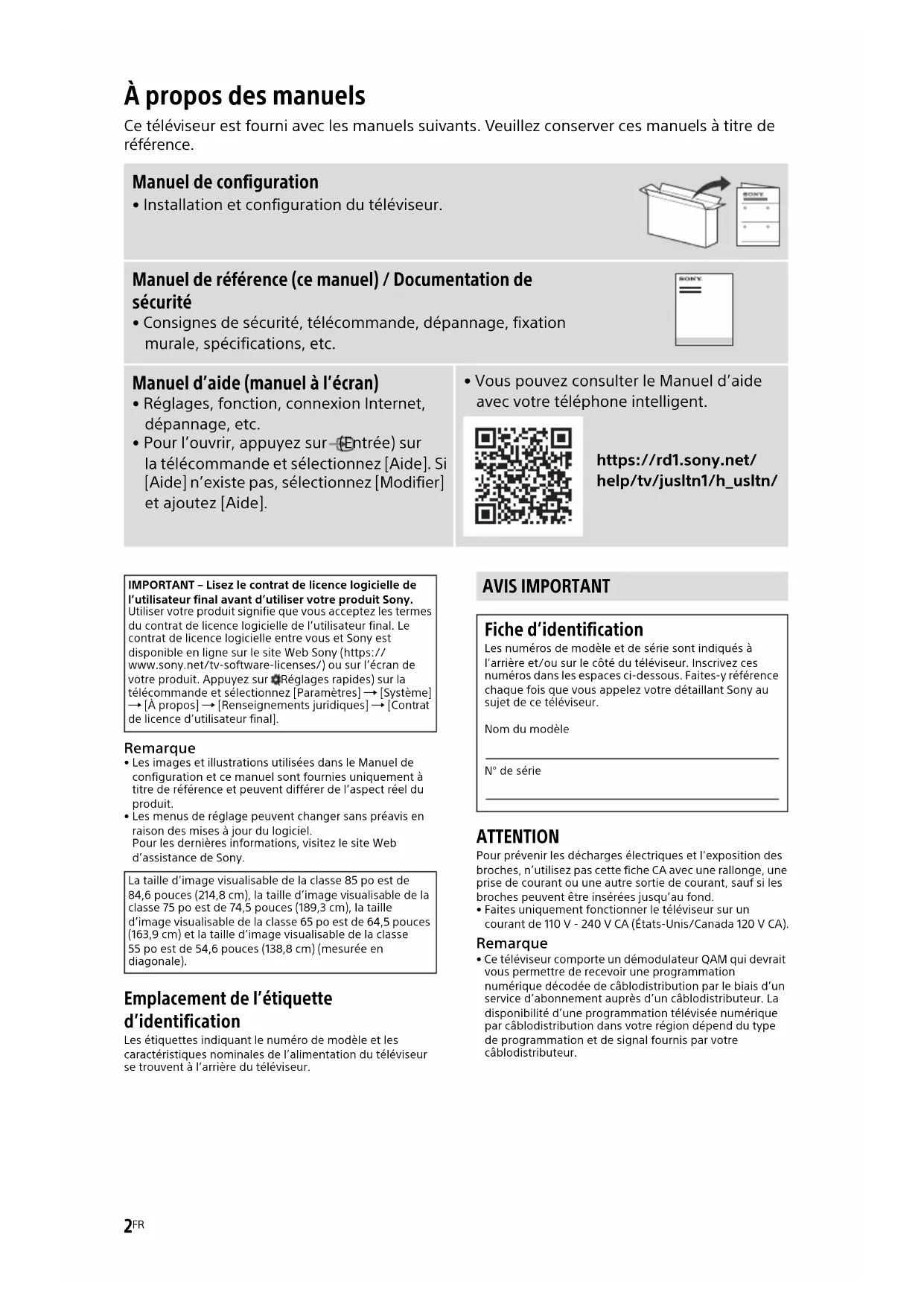 - Vous pouvez consulter le Manuel d’aide avec votre téléphone intelligent. https://rd1.sony.net/ help/tv/jusltn1/h_usltn/ IMPORTANT – Lisez le contrat de licence logicielle de l’utilisateur final avant d’utiliser votre produit Sony. Utiliser votre produit signifie que vous acceptez les termes du contrat de licence logicielle de l’utilisateur final. Le contrat de licence logicielle entre vous et Sony est disponible en ligne sur le site Web Sony (https:// www.sony.net/tv-software-licenses/) ou sur l’écran de votre produit. Appuyez sur (Réglages rapides) sur la télécommande et sélectionnez [Paramètres] [Système] [À propos] [Renseignements juridiques] [Contrat de licence d’utilisateur final]. La taille d’image visualisable de la classe 85 po est de 84,6 pouces (214,8 cm), la taille d’image visualisable de la classe 75 po est de 74,5 pouces (189,3 cm), la taille d’image visualisable de la classe 65 po est de 64,5 pouces (163,9 cm) et la taille d’image visualisable de la classe 55 po est de 54,6 pouces (138,8 cm) (mesurée en diagonale). AVIS IMPORTANT Fiche d’identification Les numéros de modèle et de série sont indiqués à l’arrière et/ou sur le côté du téléviseur. Inscrivez ces numéros dans les espaces ci-dessous. Faites-y référence chaque fois que vous appelez votre détaillant Sony au sujet de ce téléviseur. Nom du modèle N° de série3