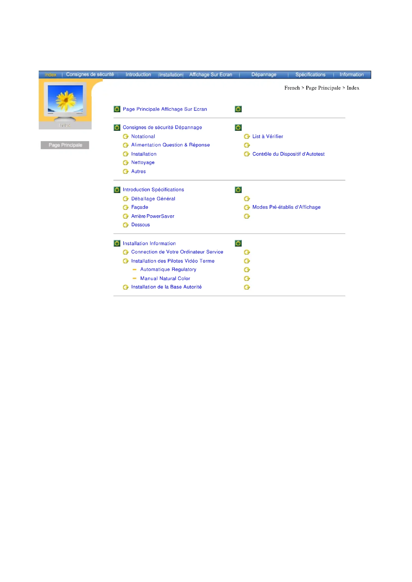 Distance entre deux points L'image de l'écran est composée de points rouges, vert et bleus. Plus les points sont proches, plur la resolution est haute. La distance entre deux points de même couleur est appelé 'Distance entre les Deux Points'. Unité: mm Fréquence Verticale L'écran doit être réaffiché plusieurs fois par seconde afin de créer et afficher l'image pour l'utilisateur. La fréquence de cette répétition par seconde est appelée Fréquence Verticale ou le Taux de RafraÎchissement. Unité: Hz Example: Si le même point lumineux s affiche 60 fois par seconde, il est considéré comme étant à 60 hertz. Dans ce cas-ci, le clignotement sur l'écran peut être détecté. Pour éviter ce problème, vous avez à votre disposition le mode Sans Scintillement avec une fréquence verticale supérieure à 70Hz. Fréquence Horizontale Le temps de balayer une ligne reliant le bord droit au bord gauche horizontale de l'écran s'appelle Cycle Horizontale. Le nombre inverse de Cycle Horizontale est appelé la Fréquence Horizontale. Unité: kHz Entrecroiser et methode de Non-Entrecroiser La methode Entrecroisé consiste à montrer les lignes horizontales de l'écran dans l'ordre de haut en bas. La méthode Non-Entrecroisé est utilisé dans la plupart des moniteurs pour s`assurer une image claire. La méthode Entrecroisé est la même que celle de la télévision. Plug & Play Ceci est une fonction qui apporte la meilleure qualité d'écran pour l'utilisateur en permettant l' échange d'informations automatique entre l'ordinateur et le moniteur. Ce moniteur suit le standard international VESA DDC pour la fonction Plug & Play. Résolution Le nombre de points verticaux et horizontaux constituent l'image d'écran appelée 'résolution'. Ce nombre montre la précision de l'affichage. La haute résolution est excellente pour accomplir des tâches multiples car plus d'informations et d `images peuvent être affichées sur l'écran. Example: Si la résolution est de 1024x768, cela signifie que l'écran est constitué de 1024 points horizontaux (resolution horizontale) et de 768 lignes verticales(résolution verticale). MagicBright™ MagicBright est une nouvelle fonction du moniteur qui offre une qualité d'affichage en matière de luminosité et de clarté deux fois supérieure à celle d'autres moniteurs existants. Cette fonction fournit une luminosité et une résolution d'affichage plus adaptées à la visualisation de texte, d'Internet ou d'animations multimédia pour satisfaire les divers besoins de l'utilisateur. L'utilisateur peut facilement sélectionner l'une des trois options de luminosité et de résolution pré-configurées en appuyant simplement sur l'un des boutons de contrôle de MagicBright qui sont situés à l'avant du moniteur.French > Page Principale > Information > Regulatory Service Terme Regulatory Natural Color Autorité FCC Information User Instructions The Federal Communications Commission Radio Frequency Interference Statement includes the following warning: Note: This equipment has been tested and found to comply with the limits for a Class B digital device, pursuant to Part 15 of the FCC Rules. These limits are designed to provide reasonable protection against harmful interference in a residential installation. This equipment generates, uses, and can radiate radio frequency energy and, if not installed and used in accordance with the instructions, may cause harmful interference to radio communications. However, there is no guarantee that interference will not occur in a particular installation. If this equipment does cause harmful interference to radio or television receptions, which can be determined by turning the equipment off and on, the user is encouraged to try to correct the interference by one or more of the following measures: ? Reorient or relocate the receiving antenna. ? Increase the separation between the equipment and receiver. ? Connect the equipment into an outlet on a circuit different from that to which the receiver is connected. ? Consult the dealer or an experienced radio/TV technician for help. User Information Changes or modifications not expressly approved by the party responsible for compliance could void the user's authority to operate the equipment. If necessary, consult your dealer or an experienced radio/television technician for additional suggestions. You may find the booklet called How to Identify and Resolve Radio/TV Interference Problems helpful. This booklet was prepared by the Federal Communications Commission. It is available from the U.S. Government Printing Office, Washington, DC 20402, Stock Number 004-000-00345-4. Warning User must use shielded signal interface cables to maintain FCC compliance for the product. Declaration of conformity for products Marked with FCC Logo This device complies with Part 15 of the FCC Rules. Operation is subject to the following two conditions: (1) this device may not cause harmful interference, and (2) this device must accept any interference received, including interference that may cause undesired operation. The party responsible for product compliance: