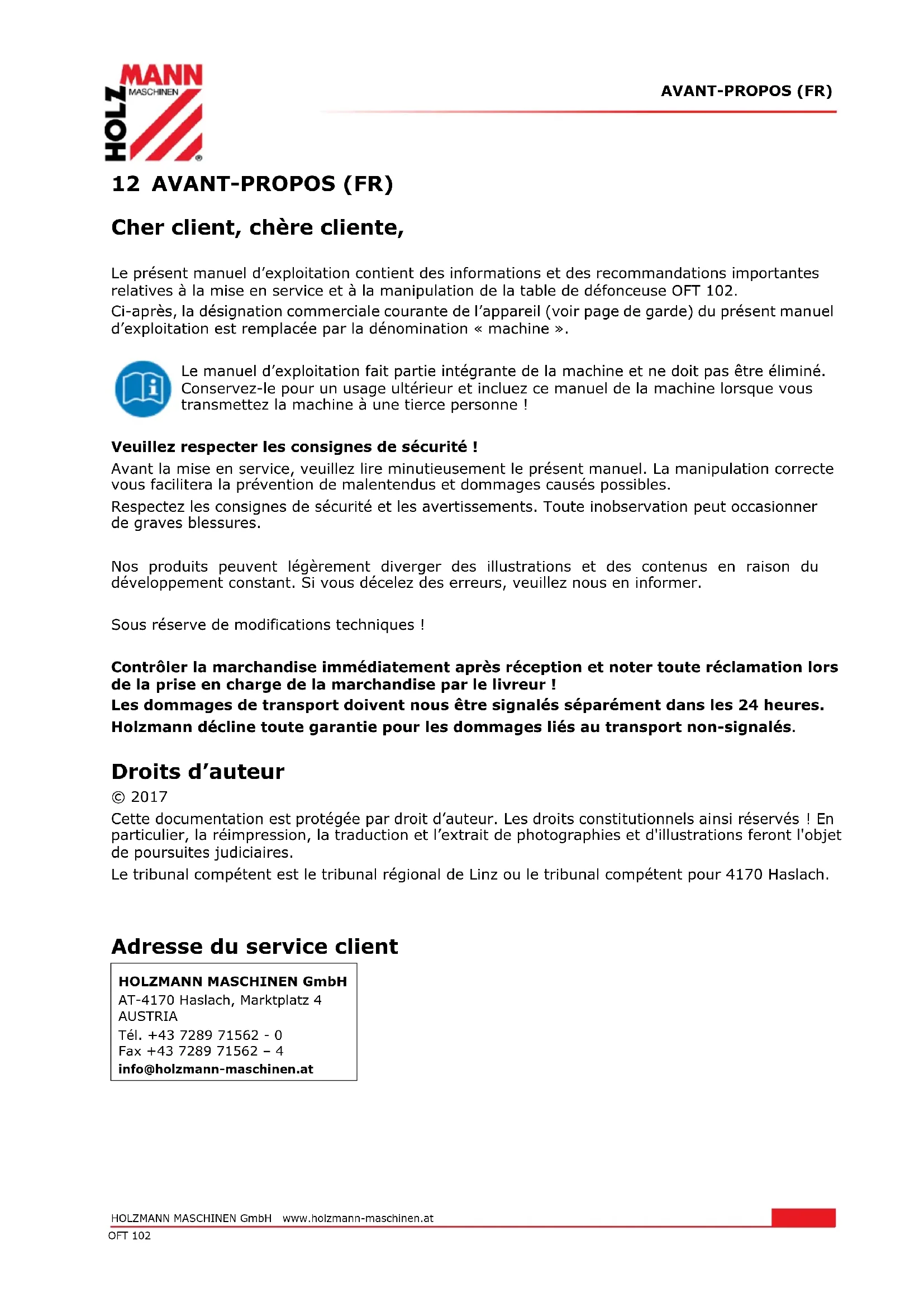 WARNING Hook and loop fastener only for the use of the router with the router tableAVANT-PROPOS (FR) HOLZMANN MASCHINEN GmbH www.holzmann-maschinen.at 14 OFT 102 12 AVANT-PROPOS (FR) Cher client, chère cliente, Le présent manuel d’exploitation contient des informations et des recommandations importantes relatives à la mise en service et à la manipulation de la table de défonceuse OFT 102. Ci-après, la désignation commerciale courante de l’appareil (voir page de garde) du présent manuel d’exploitation est remplacée par la dénomination « machine ». Le manuel d’exploitation fait partie intégrante de la machine et ne doit pas être éliminé. Conservez-le pour un usage ultérieur et incluez ce manuel de la machine lorsque vous transmettez la machine à une tierce personne ! Veuillez respecter les consignes de sécurité ! Avant la mise en service, veuillez lire minutieusement le présent manuel. La manipulation correcte vous facilitera la prévention de malentendus et dommages causés possibles. Respectez les consignes de sécurité et les avertissements. Toute inobservation peut occasionner de graves blessures. Nos produits peuvent légèrement diverger des illustrations et des contenus en raison du développement constant. Si vous décelez des erreurs, veuillez nous en informer. Sous réserve de modifications techniques ! Contrôler la marchandise immédiatement après réception et noter toute réclamation lors de la prise en charge de la marchandise par le livreur ! Les dommages de transport doivent nous être signalés séparément dans les 24 heures. Holzmann décline toute garantie pour les dommages liés au transport non-signalés. Droits d’auteur © 2017 Cette documentation est protégée par droit d’auteur. Les droits constitutionnels ainsi réservés ! En particulier, la réimpression, la traduction et l’extrait de photographies et d'illustrations feront l'objet de poursuites judiciaires. Le tribunal compétent est le tribunal régional de Linz ou le tribunal compétent pour 4170 Haslach.