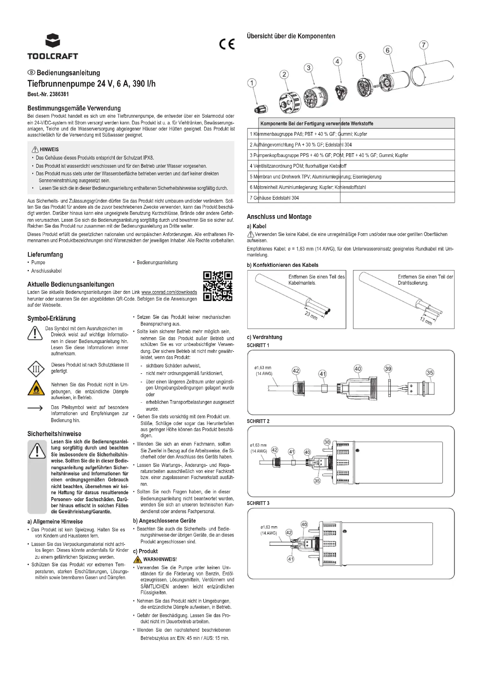 This is a publication by Conrad Electronic SE, Klaus-Conrad-Str. 1, D-92240 Hirschau (www.conrad.com). All rights in- cluding translation reserved. Reproduction by any method, e.g. photocopy, microlming, or the capture in electronic data processing systems require the prior written approval by the editor. Reprinting, also in part, is prohibited. This publication represent the technical status at the time of printing. Copyright 2022 by Conrad Electronic SE. *2386381_v3_0422_02_dh_m_enVue d’ensemble des pièces Pièce Description du matériel 1 Montage de la pince de serrage PA6 ; PBT + 40 % GF; caoutchouc ; cuivre 2 Montage de la plaque de levage PA + 30 % GF ; acier inoxydable 304 3 Ensemble tête de pompe PPS + 40 % GF ; POM ; PBT + 40 % GF ; caoutchouc ; cuivre 4 Montage du siège de valve POM;colleuorine 5 Montage d’un réservoir à diaphragme et d’une pompe rotative TPV ; alliage en aluminium ; ferroalliage 6 Montage du moteur Alliage en aluminium ; cuivre ; acier au carbone 7 Manchon Acier inoxydable 304 Raccordement et montage a) Câble N’utilisez pas de câbles présentant des surfaces irrégulières, rugueuses ou rainurées. Câble recommandé : ø1,63 mm (14 AWG) câble immergeable gainé. b) Préparation du câble 23 mm13 mmStrip the outer cable jacket Cut the lead wires Dénudez la gaine extérieure du câble Coupezleslsconducteurs c) Câblage Étape 1 ø1.63mm (14 AWG) Étape 2 ø1.63mm (14 AWG) Étape 3 ø1.63mm (14 AWG) Mode d’emploi Pompe immergée pour forage 24 V, 6 A, 390 l/h N° de commande 2386381 Utilisation prévue Ce produit est une pompe immergée pour forage. Il a été conçu pour fonctionner soit à l’aide une plaque solaire ou d’une systeme de 24 volts. Il est doté d’applications pouvant servir à l’abreuvement du bétail, à l’irrigation, à l’alimentation en eau des étangs, des maisons et des cabanes éloignées. Il est recommandé de l’utiliser avec de l’eau froide. REMARQUE