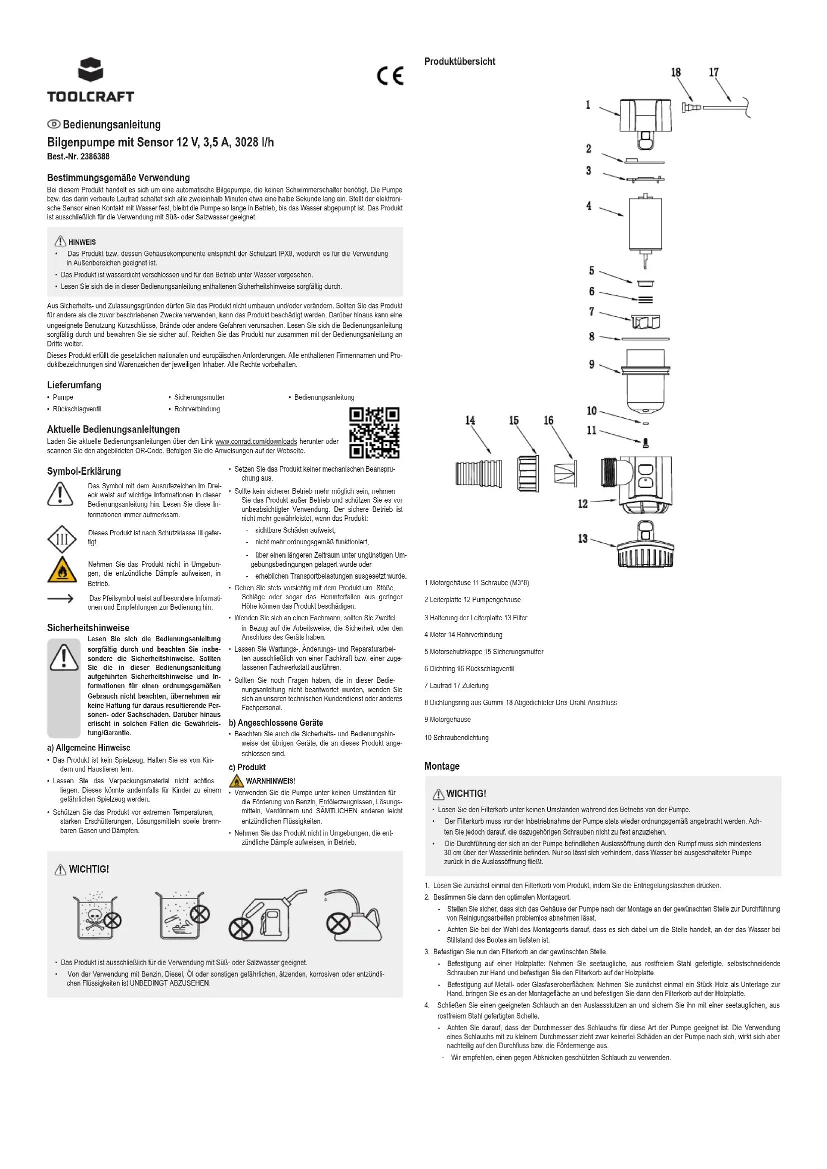 - Enlevez les débris qui s’accumulent autour du panier du ltre, de la chambre de la pompe et de la roue. Élimination des déchets Les appareils électroniques sont des matériaux recyclables et ne doivent pas être éliminés avec les ordures ménagères. En n de vie, éliminez l’appareil conformément aux dispositions légales en vigueur. Ainsi, vous respectez les ordonnances légales et contribuez à la protection de l’en- vironnement. Caractéristiques techniques Tension/courant d’entrée ................................... 12 V/CC, 3,5 A Fusible ...............................................................6 A Classe de protection .......................................... III Protection contre les inltrations ........................ IPX8 Fonctionnement à sec sans danger .................. oui Protégé contre toute inammation ..................... oui Cycle de service ................................................intermittente Amorçage automatique ..................................... oui Milieu uidique ................................................... eau douce, eau salée Température du uide ........................................ 43 ºC max. Tête de décharge (max). ...................................3 m Profondeur d’immersion (max.) .........................2 m Granulométrie (max.) ......................................... 2,1 mm Fils conducteurs ................................................ longueur : 1 m, ø1,024 mm (18 AWG) Débit .................................................................. 3028 l/h Raccordement de tuyau .................................... Ø19 mm (3/4 po), ø29 mm (1 1/8 po) Température de fonctionnement/stockage ........ 0 à +40 ºC Dimensions (l x h x p) ........................................70 x 110 x 132 mm Poids .................................................................. 345 g Ce document est une publication de Conrad Electronic SE, Klaus-Conrad-Strasse 1, D-92240 Hirschau - Allemagne (www.conrad.com). Tous droits réservés y compris la traduction. La reproduction par n'importe quel moyen, p. ex. photo- copie, microlm ou saisie dans des systèmes de traitement électronique des données, nécessite l'autorisation préalable par écrit de l'éditeur. La réimpression, même en partie, est interdite. Cette publication représente l'état technique au moment de l'impression. Copyright 2021 by Conrad Electronic SE. *2386388_v2_1121_02_dh_mh_fr 3,8 cm 12 V/CCOverzicht 1 Motordeksel 11 Schroef M3*8 2 Printplaat 12 Pompbehuizing 3 Beugel printplaat 13 Filter 4 Motor 14 Pijpkoppeling 5 Beschermkap motor 15 Borgmoer 6 Oliekeerring 16 Terugslagklep 7 Waaier 17 Draad 8 Rubberen afdichtingsring 18 3-draads afgedichte verbinding 9 Motordeksel 10 Schroefafdichting Installatie BELANGRIJK!