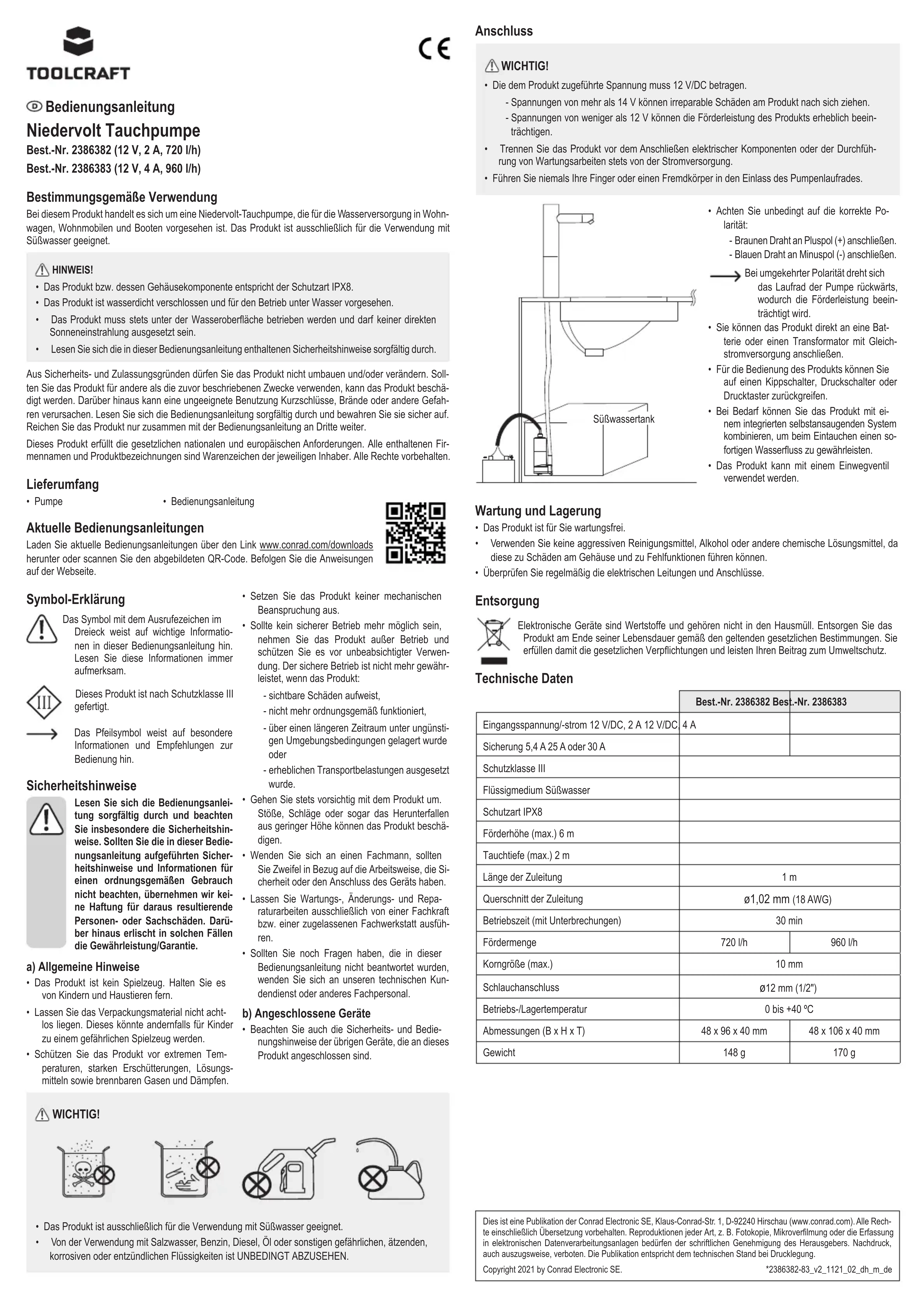 - Pompe • Mode d’emploi Mode d’emploi actualisé Téléchargez le mode d’emploi le plus récent sur www.conrad.com/downloads ou scan- nez le code QR indiqué. Suivez les instructions gurant sur le site Web. Explication des symboles Le symbole avec le point d’exclamation dans un triangle sert à indiquer les infor- mations importantes présentes dans ce mode d’emploi. Veuillez lire ces informa- tions attentivement. Le produit a été fabriqué selon la classe de protection III. Le symbole de la èche indique des informations spéciques et des conseils spéciaux pour le fonctionnement. Consignes de sécurité Lisez attentivement le mode d’em- ploi et observez particulièrement les consignes de sécurité. Nous déclinons toute responsabilité en cas de dommages corporels ou ma- tériels résultant du non-respect des consignes de sécurité et des infor- mations relatives à la manipulation correcte contenues dans ce manuel. De tels cas entraînent l’annulation de la garantie. a) Informations générales