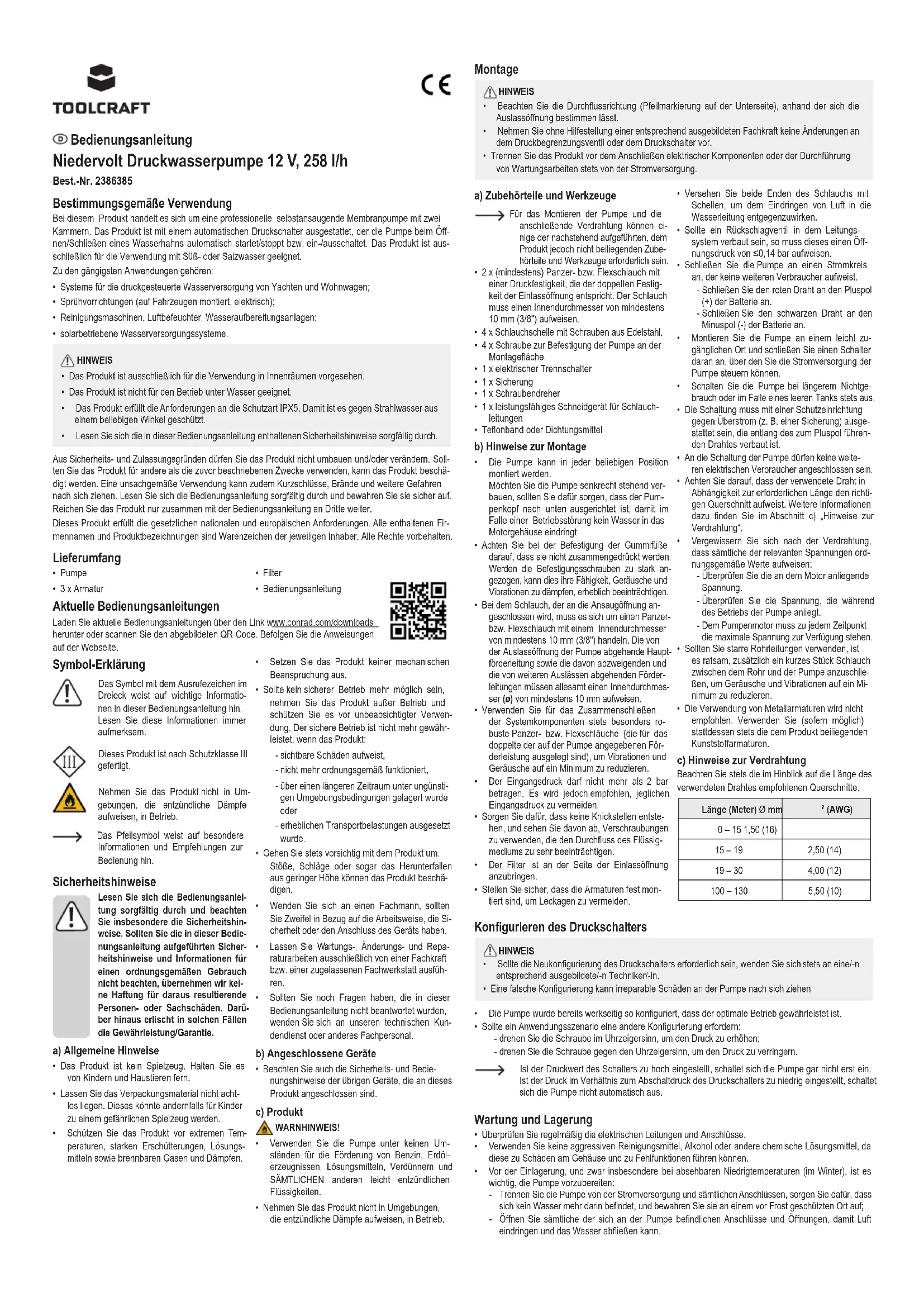 - Si la pompe est raccordée à un tuyau rigide, elle peut transmettre du bruit. Élimination des déchets Les appareils électroniques sont des matériaux recyclables et ne doivent pas être éliminés avec les ordures ménagères. En n de vie, éliminez l’appareil conformément aux dispositions légales en vigueur. Ainsi, vous respectez les ordonnances légales et contribuez à la protection de l’en- vironnement. Caractéristiques techniques Tension/courant d’entrée .................................. 12 V/DC, 4 A Fusible .............................................................. 8 A Classe de protection ......................................... III Protection contre les inltrations ....................... IPX5 Pression de réglage .......................................... 2,4 bar Pression d’entrée .............................................. 2 bar max. Fonctionnement à sec sans danger ................. oui Cycle de service ............................................... intermittente Pressostat réglable ........................................... oui Dérivation réglable ............................................ non Amorçage automatique .................................... oui Protection thermique ........................................ oui Protégé contre toute inammation .................... non Type de pompe ................................................. diaphragme Amorçage ......................................................... hauteur d’aspiration 1,8 m Milieu uidique .................................................. eau douce, eau salée Température du uide ....................................... 60 ºC max. Tête de décharge ............................................. 20 m max Fil conducteur ................................................... longueur : 33 cm, ø1 mm² (18 AWG) Débit ................................................................. 258 l/h max Raccordement de tuyau ................................... Ø10 mm (3/8 po) Température de fonctionnement/stockage ....... 0 à +40 ºC Dimensions (l x h x p) ....................................... 98 x 62 x 169 mm Poids ................................................................. 600 g Ce document est une publication de Conrad Electronic SE, Klaus-Conrad-Strasse 1, D-92240 Hirschau - Allemagne (www.conrad.com). Tous droits réservés y compris la traduction. La reproduction par n'importe quel moyen, p. ex. photo- copie, microlm ou saisie dans des systèmes de traitement électronique des données, nécessite l'autorisation préalable par écrit de l'éditeur. La réimpression, même en partie, est interdite. Cette publication représente l'état technique au moment de l'impression.Copyright 2022 by Conrad Electronic SE. *2386385_v4_0922_02_dh_m_fr Vue d’ensemble des pièces