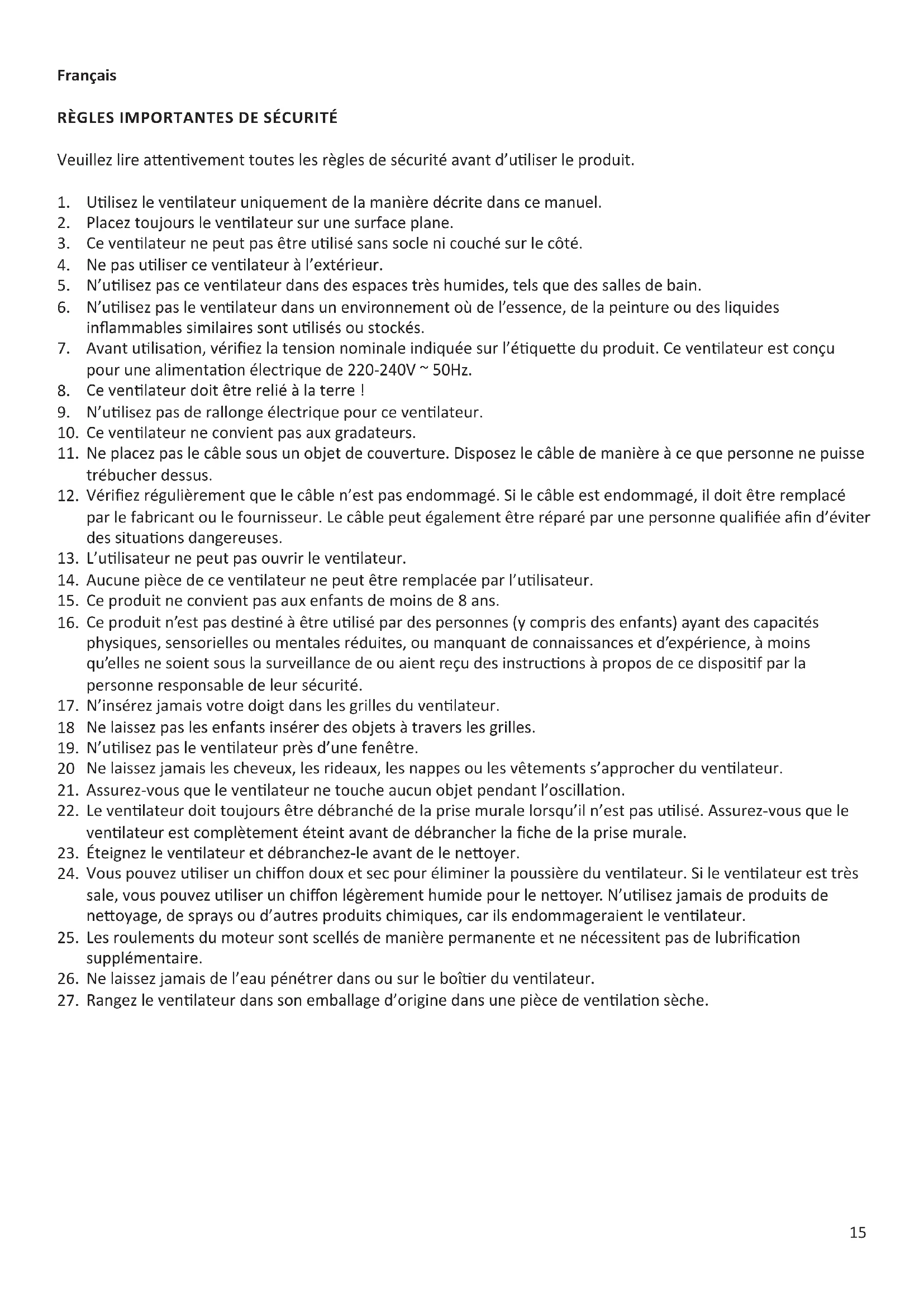 Ulisez le venlateur uniquement de la manière décrite dans ce manuel. Placez toujours le venlateur sur une surface plane. Ce venlateur ne peut pas être ulisé sans socle ni couché sur le côté. Ne pas uliser ce venlateur à l’extérieur. N’ulisez pas ce venlateur dans des espaces très humides, tels que des salles de bain. N’ulisez pas le venlateur dans un environnement où de l’essence, de la peinture ou des liquides inammables similaires sont ulisés ou stockés. Avant ulisaon, vériez la tension nominale indiquée sur l’équee du produit. Ce venlateur est conçu pour une alimentaon électrique de 220-240V ~ 50Hz. Ce venlateur doit être relié à la terre ! N’ulisez pas de rallonge électrique pour ce venlateur. Ce venlateur ne convient pas aux gradateurs. Ne placez pas le câble sous un objet de couverture. Disposez le câble de manière à ce que personne ne puisse trébucher dessus. Vériez régulièrement que le câble n’est pas endommagé. Si le câble est endommagé, il doit être remplacé par le fabricant ou le fournisseur. Le câble peut également être réparé par une personne qualiée an d’éviter des situaons dangereuses. L’ulisateur ne peut pas ouvrir le venlateur. Aucune pièce de ce venlateur ne peut être remplacée par l’ulisateur. Ce produit ne convient pas aux enfants de moins de 8 ans. Ce produit n’est pas desné à être ulisé par des personnes (y compris des enfants) ayant des capacités physiques, sensorielles ou mentales réduites, ou manquant de connaissances et d’expérience, à moins qu’elles ne soient sous la surveillance de ou aient reçu des instrucons à propos de ce disposif par la personne responsable de leur sécurité. N’insérez jamais votre doigt dans les grilles du venlateur. Ne laissez pas les enfants insérer des objets à travers les grilles. N’ulisez pas le venlateur près d’une fenêtre. Ne laissez jamais les cheveux, les rideaux, les nappes ou les vêtements s’approcher du venlateur. Assurez-vous que le venlateur ne touche aucun objet pendant l’oscillaon. Le venlateur doit toujours être débranché de la prise murale lorsqu’il n’est pas ulisé. Assurez-vous que le venlateur est complètement éteint avant de débrancher la che de la prise murale. Éteignez le venlateur et débranchez-le avant de le neoyer. Vous pouvez uliser un chion doux et sec pour éliminer la poussière du venlateur. Si le venlateur est très sale, vous pouvez uliser un chion légèrement humide pour le neoyer. N’ulisez jamais de produits de neoyage, de sprays ou d’autres produits chimiques, car ils endommageraient le venlateur. Les roulements du moteur sont scellés de manière permanente et ne nécessitent pas de lubricaon supplémentaire. Ne laissez jamais de l’eau pénétrer dans ou sur le boîer du venlateur. Rangez le venlateur dans son emballage d’origine dans une pièce de venlaon sèche.STRUCTURE DU VENTILATEUR