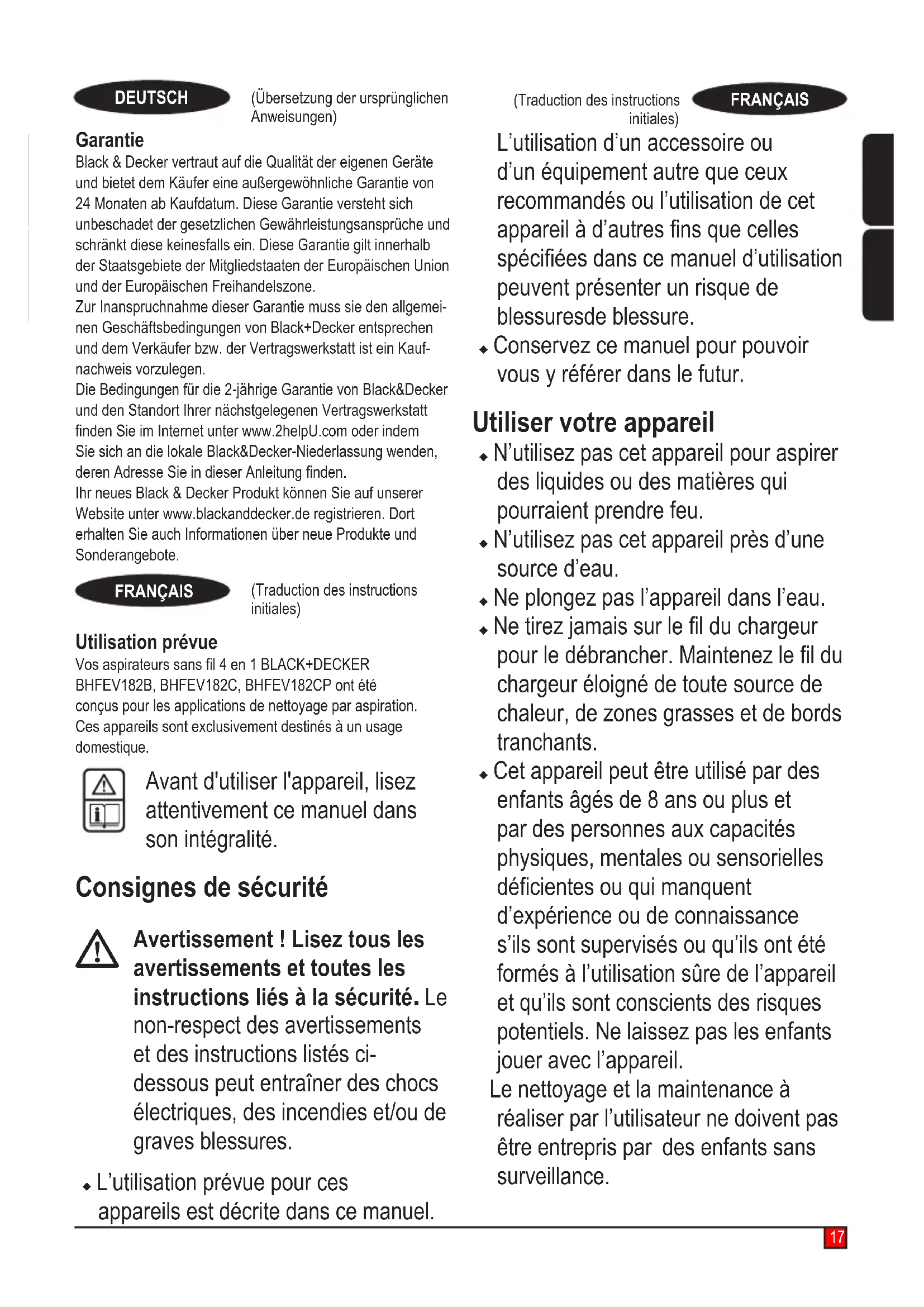 Avertissement ! Lisez tous les avertissements et toutes les instructions liés à la sécurité. Le non-respect des avertissements et des instructions listés ci- dessous peut entraîner des chocs électriques,desincendieset/oude graves blessures. u L’utilisation prévue pour ces appareils est décrite dans ce manuel. L’utilisation d’un accessoire ou d’un équipement autre que ceux recommandés ou l’utilisation de cet appareilàd’autresnsquecelles spéciéesdanscemanueld’utilisation peuvent présenter un risque de blessuresde blessure. u Conservez ce manuel pour pouvoir vous y référer dans le futur. Utiliser votre appareil u N’utilisez pas cet appareil pour aspirer des liquides ou des matières qui pourraient prendre feu. u N’utilisez pas cet appareil près d’une source d’eau. u Ne plongez pas l’appareil dans l’eau.u Netirezjamaissurlelduchargeur pourledébrancher.Maintenezleldu chargeur éloigné de toute source de chaleur, de zones grasses et de bords tranchants. u Cet appareil peut être utilisé par des enfants âgés de 8 ans ou plus et par des personnes aux capacités physiques, mentales ou sensorielles décientesouquimanquent d’expérience ou de connaissance s’ils sont supervisés ou qu’ils ont été formés à l’utilisation sûre de l’appareil et qu’ils sont conscients des risques potentiels. Ne laissez pas les enfants jouer avec l’appareil. Le nettoyage et la maintenance à réaliser par l’utilisateur ne doivent pas être entrepris par des enfants sans surveillance.18 (Traduction des instructions initiales) FRANÇAIS Vérication et réparations Avantutilisation,vériezquel’appareil et ses pièces ne sont ni endommagés, ni défectueux. Contrôlez l’absence de pièces cassées, d’interrupteurs endom- magés et de toutes autres anomalies susceptibles de nuire au bon fonctionne- ment de l’appareil. u N’utilisez pas l’appareil si une quelconque pièce est endommagée ou défectueuse. u Faites réparer ou remplacer les pièces défectueuses ou endommagées par un réparateur agréé. u Vériezrégulièrementl’étatduldu chargeur.Silelestendommagéou défectueux, remplacez le chargeur. u Ne tentez jamais de retirer ou de remplacer des pièces autres que celles citées dans ce manuel. Consignes de sécurité supplé- mentaires Après l’utilisation u Débranchez le chargeur pour le nettoyer ou pour nettoyer la station de charge. u Lorsque vous n’utilisez pas l’appareil, rangez-le dans un endroit sec. u Les enfants ne doivent pas avoir accès aux appareils rangés. Risques résiduels Certains risques résiduels autres que ceux mentionnés dans les avertisse- ments sur la sécurité peuvent survenir en utilisant l’outil. Ces risques peuvent être provoqués par une utilisation incorrecte, prolongée, etc. Malgré l’application des normes de sécu- rité pertinentes et la mise en œuvre de dispositifs de sécurité, certains risques résiduels ne peuvent pas être évités. Ils comprennent : u Les blessures provoquées par le contactavecdespiècesrotatives/ mobiles. u Les blessures provoquées pendant le remplacement de pièces, de lames ou d’accessoires. u Les blessures dues à l’utilisation prolongée d’un outil. Lorsqu’un outil est utilisé pendant de longues périodes, assurez-vous de faire des pauses régulières. u La diminution de l’acuité auditive.u Les risques pour la santé provoqués par l’inhalation des poussières générées pendant l’utilisation de votre outil (exemple : travail avec du bois, surtout le chêne, le hêtre et les panneaux en MDF) Chargeurs Votre chargeur a été conçu pour une tensionspécique.Vérieztoujoursque la tension du réseau électrique corre- spondàlatensiongurantsurlaplaque signalétique. Avertissement ! N’essayez jamais de remplacer l’appareil de charge par une prise secteur ordinaire. u N’utilisez votre chargeur BLACK+DECKER que pour recharger la batterie fournie avec l’appareil.19 (Traduction des instructions initiales)FRANÇAIS D’autres batteries pourraient exploser et provoquer des blessures et des dommages. u Ne tentez jamais de recharger des batteries non rechargeables. u Si le câble d’alimentation est endommagé, il doit être remplacé par le fabricant ou par un centre d’assistance agréé BLACK+DECKER and’évitertoutrisque. u N’exposez pas le chargeur à l’eau.u N’ouvrez pas le chargeur.u Ne sondez pas le chargeur.u Pendantlacharge,l’appareil/la batterie doivent être placés dans un endroit bien aéré. Sécurité électrique Symboles sur le chargeur