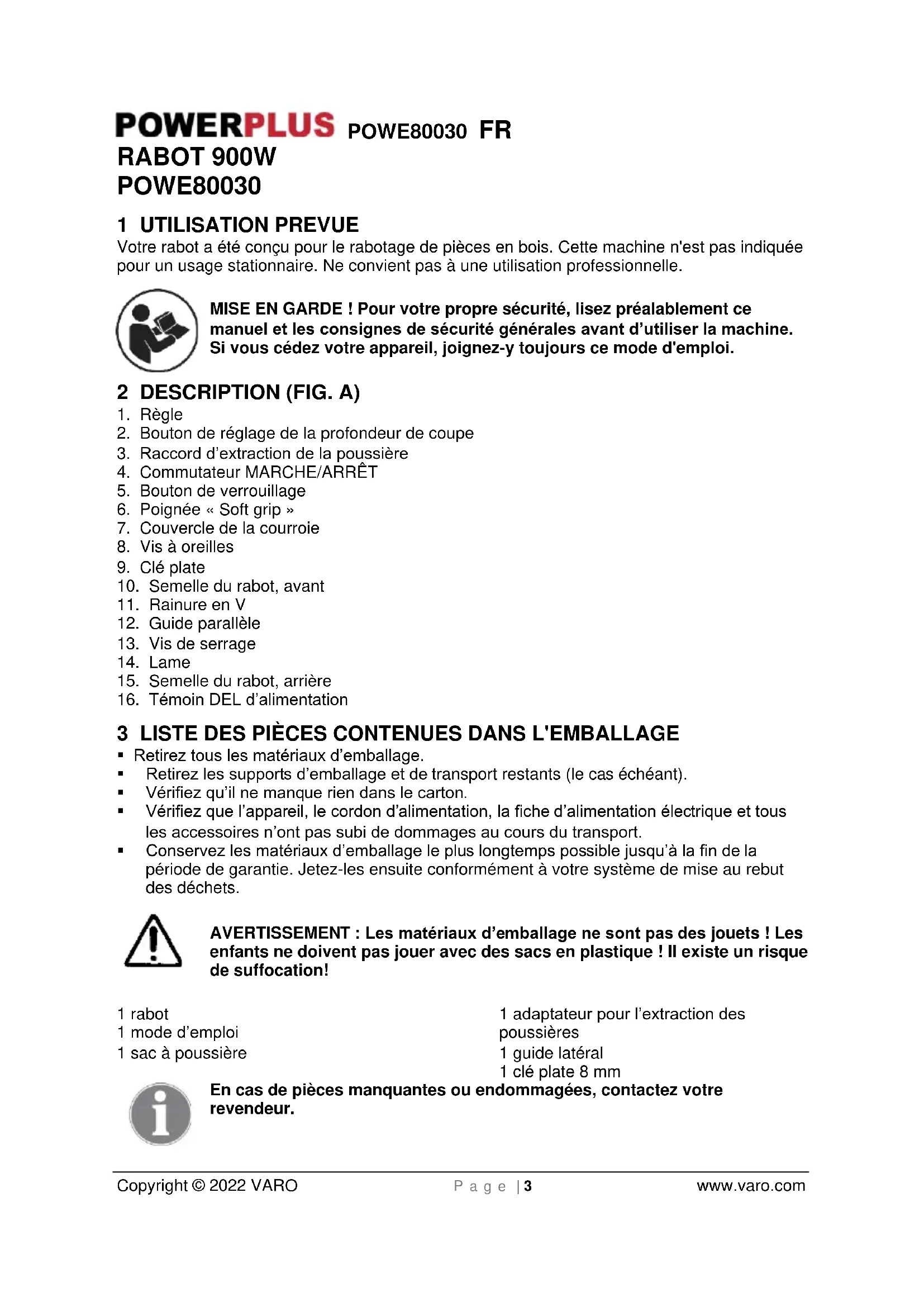Copyright © 2022 VARO P a g e | 3 www.varo.com RABOT 900W POWE80030 1 UTILISATION PREVUE Votre rabot a été conçu pour le rabotage de pièces en bois. Cette machine n'est pas indiquée pour un usage stationnaire. Ne convient pas à une utilisation professionnelle. MISE EN GARDE ! Pour votre propre sécurité, lisez préalablement ce manuel et les consignes de sécurité générales avant d’utiliser la machine. Si vous cédez votre appareil, joignez-y toujours ce mode d'emploi. 2 DESCRIPTION (FIG. A)