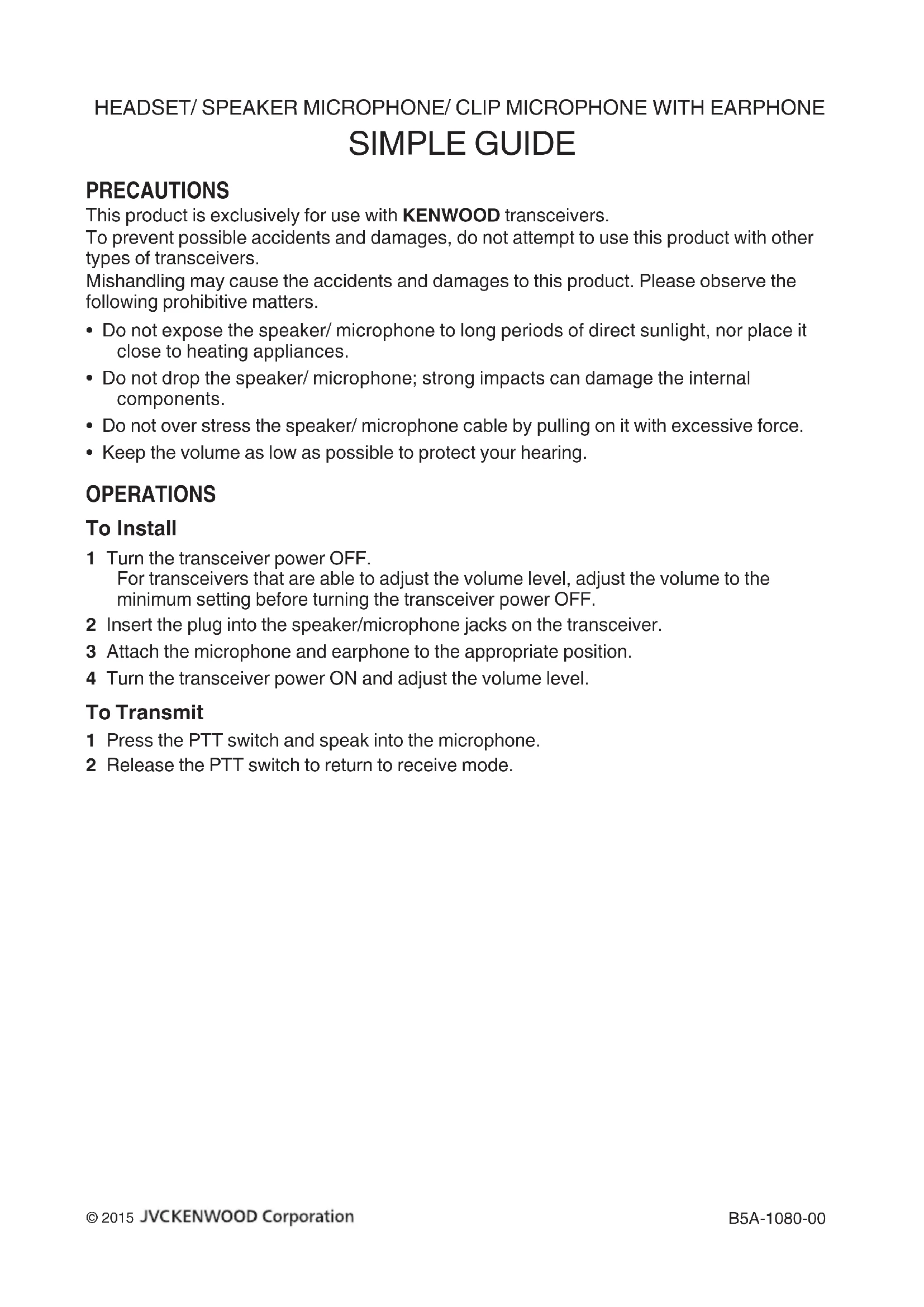 GUIDE SIMPLE PRÉCAUTIONS Cet produit doit uniquement être utilisé avec les émetteurs-récepteurs KENWOOD. Pour éviter tout dommages et accidents potentiels, n'essayez pas d'utiliser ce produit avec d'autres types d'émetteurs-récepteurs. Une mauvaise manipulation peut causer un accident et endommager ce produit. Veuillez respecter les interdictions suivantes.