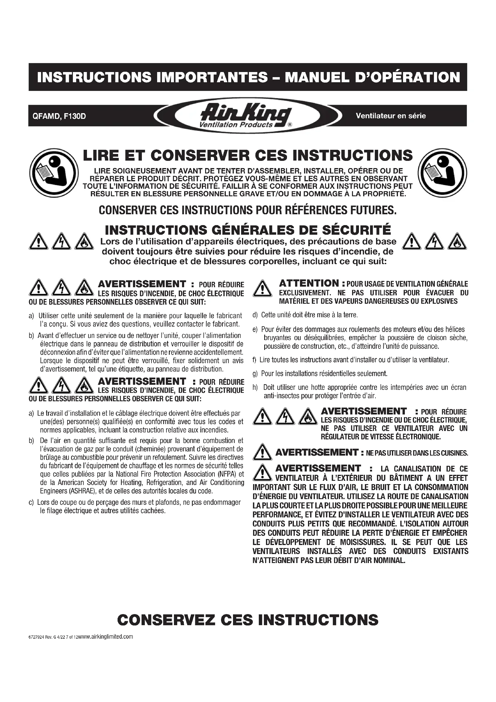 06727924 Rev. G 4/22 7 of 12www.airkinglimited.com ATTENTION : POUR USAGE DE VENTILATION GÉNÉRALE EXCLUSIVEMENT. NE PAS UTILISER POUR ÉVACUER DU MATÉRIEL ET DES VAPEURS DANGEREUSES OU EXPLOSIVESd) Cette unité doit être mise à la terre.e) Pour éviter des dommages aux roulements des moteurs et/ou des hélices bruyantes ou déséquilibrées, empêcher la poussière de cloison sèche, poussière de construction, etc., d’atteindre l’unité de puissance.f) Lire toutes les instructions avant d’installer ou d’utiliser la ventilateur.g) Pour les installations résidentielles seulement.h) Doit utiliser une hotte appropriée contre les intempéries avec un écran anti-insectes pour protéger l’entrée d’air.
