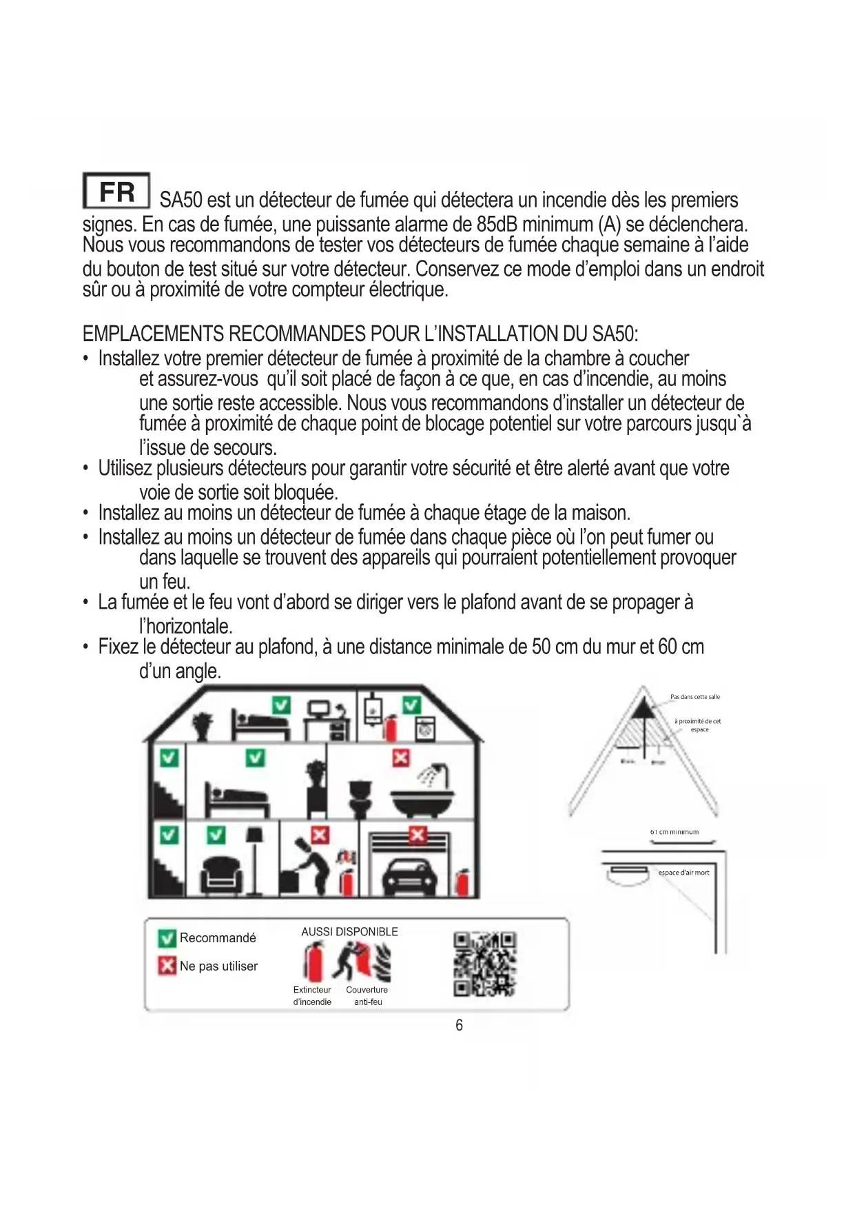 Intern circuit beschadigd Stuur terug voor reparae Geen geluid of zacht geluid van zoemer Baerij onjuist geïnstalleerd Lage baerijspanning Intern circuit beschadigd Controleer, installeer de baerij opnieuw (let op de polariteit) Vervang de baerij Stuur terug voor reparae Geen alarm bij testen Lage baerijspanningVervang de baerij Intern circuit beschadigd Stuur terug voor reparae VERKLARING VAN PERFORMANCE: De verklaring van conformiliteit is beschikbaar op onze website: http://DOC.hesdo.com/SA50_ DOP_1.pdf 5FR SA50 est un détecteur de fumée qui détectera un incendie dès les premiers signes. En cas de fumée, une puissante alarme de 85dB minimum (A) se déclenchera. Nous vous recommandons de tester vos détecteurs de fumée chaque semaine à l’aide du bouton de test situé sur votre détecteur. Conservez ce mode d’emploi dans un endroit sûr ou à proximité de votre compteur électrique. EMPLACEMENTS RECOMMANDES POUR L’INSTALLATION DU SA50: