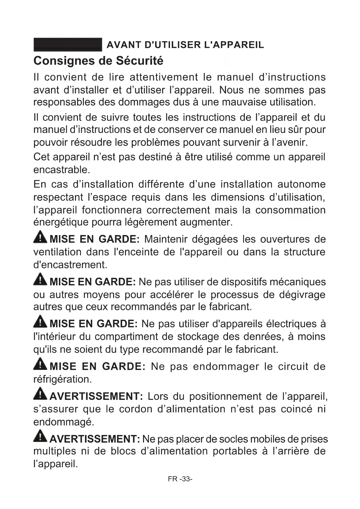INFORMATIONS POUR LES INSTITUTS DE TESTS ....................... 61FR -33- AVANT D'UTILISER L'APPAREIL SECTION - 1. Consignes de Sécurité Il convient de lire attentivement le manuel d’instructions avant d’installer et d’utiliser l’appareil. Nous ne sommes pas responsables des dommages dus à une mauvaise utilisation. Il convient de suivre toutes les instructions de l’appareil et du manuel d’instructions et de conserver ce manuel en lieu sûr pour pouvoir résoudre les problèmes pouvant survenir à l’avenir. Cet appareil n’est pas destiné à être utilisé comme un appareil encastrable. En cas d’installation différente d’une installation autonome respectant l’espace requis dans les dimensions d’utilisation, l’appareil fonctionnera correctement mais la consommation énergétique pourra légèrement augmenter. MISE EN GARDE: Maintenir dégagées les ouvertures de ventilation dans l'enceinte de l'appareil ou dans la structure d'encastrement. MISE EN GARDE: Ne pas utiliser de dispositifs mécaniques ou autres moyens pour accélérer le processus de dégivrage autres que ceux recommandés par le fabricant. MISE EN GARDE: Ne pas utiliser d'appareils électriques à l'intérieur du compartiment de stockage des denrées, à moins qu'ils ne soient du type recommandé par le fabricant. MISE EN GARDE: Ne pas endommager le circuit de réfrigération.
