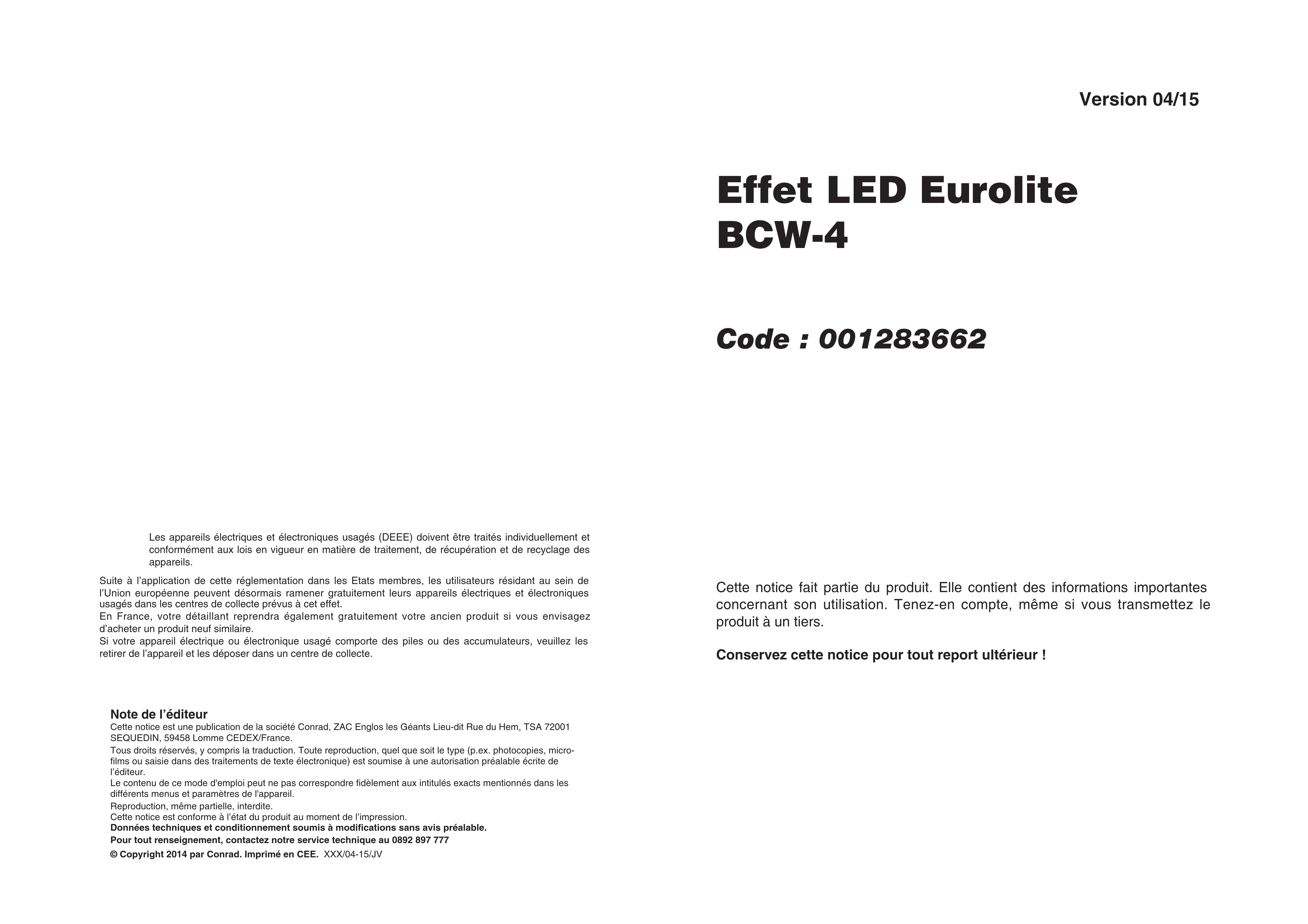 Effet LED Eurolite BCW-4 Code : 001283662 Cette notice fait partie du produit. Elle contient des informations importantes concernant son utilisation. Tenez-en compte, même si vous transmettez le produit à un tiers. Conservez cette notice pour tout report ultérieur ! NOTICE Conrad sur INTERNET www.conrad.fr Version 04/15 Les appareils électriques et électroniques usagés (DEEE) doivent être traités individuellement et conformément aux lois en vigueur en matière de traitement, de récupération et de recyclage des appareils.Suite à l’application de cette réglementation dans les Etats membres, les utilisateurs résidant au sein de l’Union européenne peuvent désormais ramener gratuitement leurs appareils électriques et électroniques usagés dans les centres de collecte prévus à cet effet.En France, votre détaillant reprendra également gratuitement votre ancien produit si vous envisagez d’acheter un produit neuf similaire.Si votre appareil électrique ou électronique usagé comporte des piles ou des accumulateurs, veuillez les retirer de l’appareil et les déposer dans un centre de collecte.Note de l’éditeurCette notice est une publication de la société Conrad, ZAC Englos les Géants Lieu-dit Rue du Hem, TSA 72001 SEQUEDIN, 59458 Lomme CEDEX/France.Tous droits réservés, y compris la traduction. Toute reproduction, quel que soit le type (p.ex. photocopies, micro-films ou saisie dans des traitements de texte électronique) est soumise à une autorisation préalable écrite de l’éditeur.Le contenu de ce mode d'emploi peut ne pas correspondre fidèlement aux intitulés exacts mentionnés dans les différents menus et paramètres de l'appareil.Reproduction, même partielle, interdite.Cette notice est conforme à l’état du produit au moment de l’impression.Données techniques et conditionnement soumis à modifications sans avis préalable.Pour tout renseignement, contactez notre service technique au 0892 897 777 © Copyright 2014 par Conrad. Imprimé en CEE. XXX/04-15/JV2 7 Entretien et nettoyage Danger de mort ! Avant d’effectuer les travaux de maintenance, débranchez impérativement l’appareil du secteur sur tous les pôles ! Retirez régulièrement les salissures comme la poussière de l’appareil. Utilisez un chiffon non pelucheux et humidifié pour nettoyer l’appareil. N’utilisez en aucun cas de l’alcool ou un solvant quelconque pour nettoyer l’appareil ! Aucune pièce nécessitant un entretien ne se trouve à l’intérieur de l’appareil. Seul un service après-vente agrée est autorisé à effectuer l’entretien et les travaux de maintenance ! Si vous avez besoin de pièces de rechange, utilisez uniquement des pièces de rechange d’origine. Afin d’éviter toute sorte d’atteinte, seul un spécialiste est autorisé à changer le câble d’alimentation, lorsqu’il est endommagé. Si le câble secteur de cet appareil est endommagé, il doit être remplacé par un câble secteur spécial disponible chez votre revendeur spécialisé. Pour plus de renseignements, veuillez vous adresser à votre revendeur spécialisé. Caractéristiques techniques Tension d’alimentation : 100 à 240 V/AC, 50/60 Hz ~ Puissance électrique totale : 7 W Type de LED (effet lumineux supérieur) : 3 LEDs RGB 1 W Type de LED (couronne) : 48 LEDs RGB 5 mm Dimensions (L x l x h) : 128 x 128 x 130 mm Température ambiante maximale Ta : 45°C Température max. de la lampe au régime définitif Tc : 70°C Distance minimale par rapport aux surfaces inflammables : 0,50 m Distance minimale par rapport à l’objet illuminé : 0,10 m Poids : 0,3 kg6 3 Montage Risque d’incendie Assurez-vous lors du montage qu’il n’y ait pas de matériau facilement inflammable en contact avec le boîtier (distance minimale 0,5 m). L’appareil peut aussi bien être installé sur un mur qu’au niveau du plafond. Fixation Avant de procéder au montage, assurez-vous que la surface de montage puisse supporter au moins 5 fois la charge ponctuelle du poids de l’appareil. Le lieu d’installation doit être choisi pour que l’appareil puisse être fixé sur une surface totalement plane, protégée des vibrations/tremblements et non inflammable. Vérifiez que la surface soit bien plane à l’aide d’un niveau à bulle. L’appareil doit être installé hors de portée des personnes. La solidité de l’installation dépend de la surface de fixation (matériau de construction), telle que le bois, le béton, le béton cellulaire, les briques. C’est pourquoi vous devez impérativement sélectionner le matériel de fixation en fonction du matériau de construction respectif. Adressez vous à un spécialiste pour obtenir l’association de vis/chevilles adaptée, en indiquant la charge maximale et le matériau en place. L’appareil doit toujours être installé sur l’ensemble des orifices de fixation. Utilisez des vis adaptées et assurez vous que celles-ci soient correctement serrées sur le support. Procédure Etape 1 : Les orifices d’installation se trouvent au niveau de la plaque de fond de l’appareil. Etape 2 : Maintenez la plaque de fond de l’appareil sur l’emplacement d’installation souhaité. Etape 3 : Marquez les orifices de perçage à l’aide d’un crayon ou d’un outil approprié. Etape 4 : Percez les orifices. Etape 5 : Serrez les vis adaptées au niveau de la surface d’installation. Etape 6 : Faites suspendre l’appareil via la plaque de fond dans la position souhaitée. Danger de mort ! Faites vérifier l’installation par un spécialiste avant la première mise en service ! Branchement au secteur Branchez l’appareil à l’aide de la fiche secteur. Lorsque vous branchez l’appareil directement sur le réseau électrique local, vous devez intégrer un séparateur avec ouverture de contact d’au moins 3 mm au niveau de chaque broche au sein de l’installation électrique existante. L’appareil doit être branché uniquement sur une installat