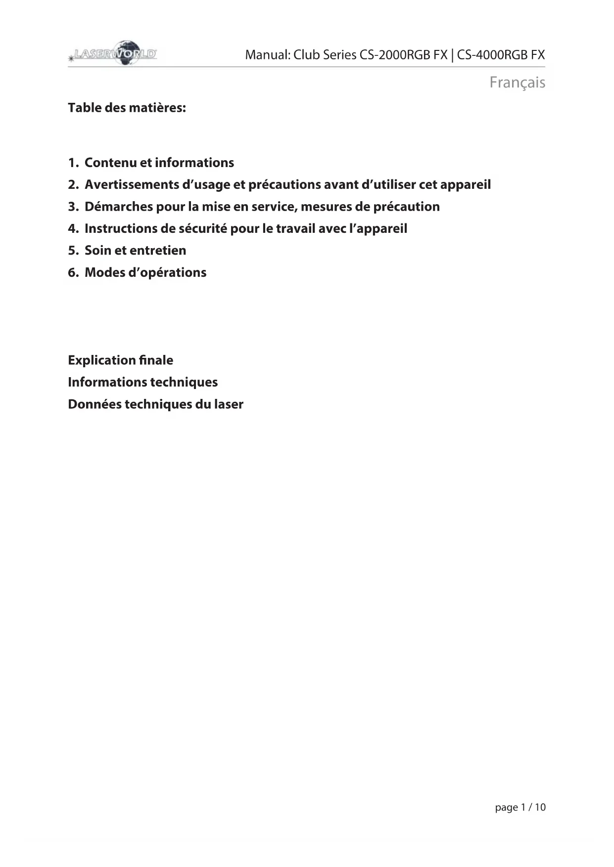 Explication nale Informations techniques Données techniques du laserManual: Club Series CS-2000RGB FX | CS-4000RGB FX page 2 / 10 Français