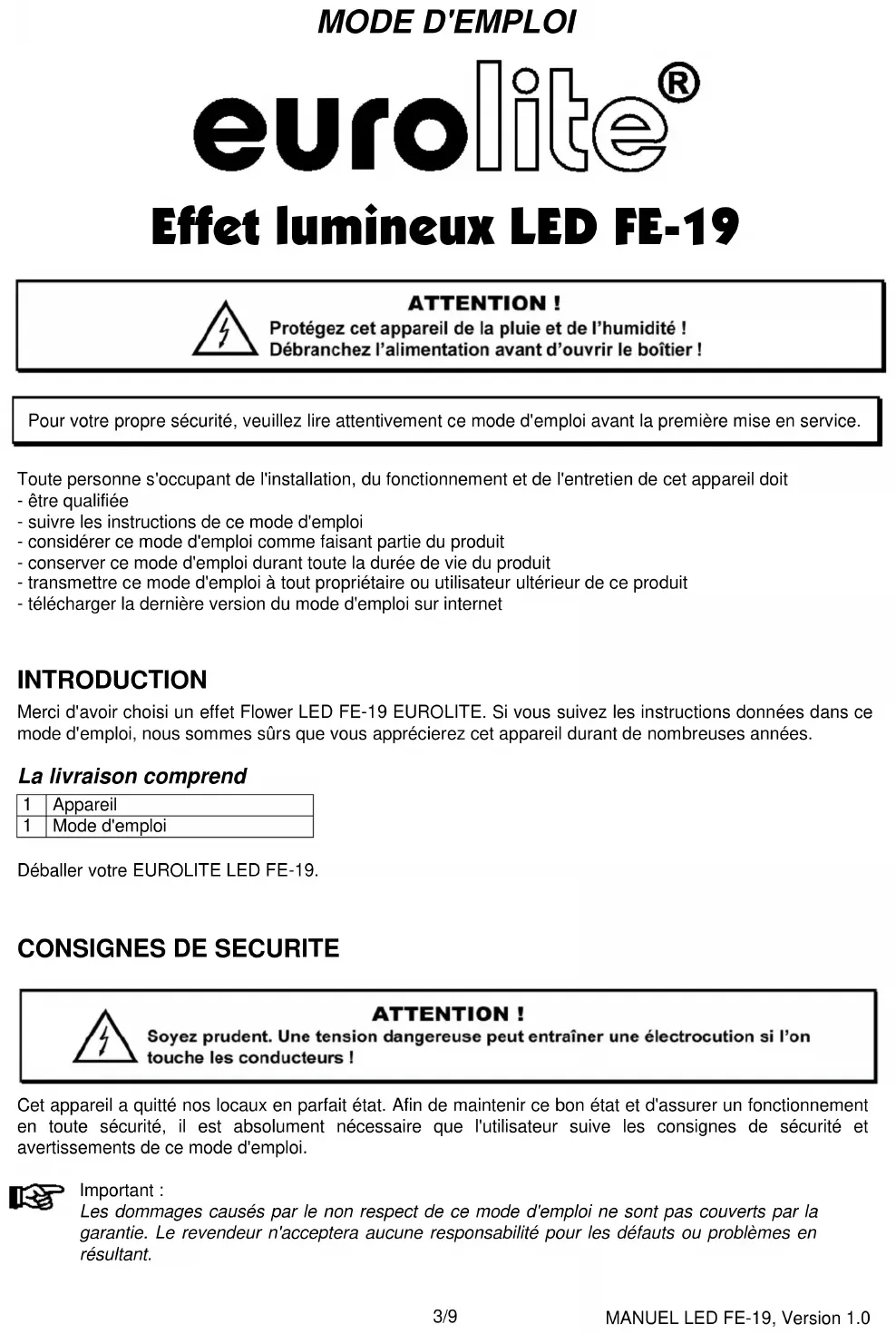Pour votre propre sécurité, veuillez lire attentivement ce mode d'emploi avant la première mise en service. Toute personne s'occupant de l'installation, du fonctionnement et de l'entretien de cet appareil doit - être qualifiée - suivre les instructions de ce mode d'emploi - considérer ce mode d'emploi comme faisant partie du produit - conserver ce mode d'emploi durant toute la durée de vie du produit - transmettre ce mode d'emploi à tout propriétaire ou utilisateur ultérieur de ce produit - télécharger la dernière version du mode d'emploi sur internet INTRODUCTION Merci d'avoir choisi un effet Flower LED FE-19 EUROLITE. Si vous suivez les instructions données dans ce mode d'emploi, nous sommes sûrs que vous apprécierez cet appareil durant de nombreuses années. La livraison comprend