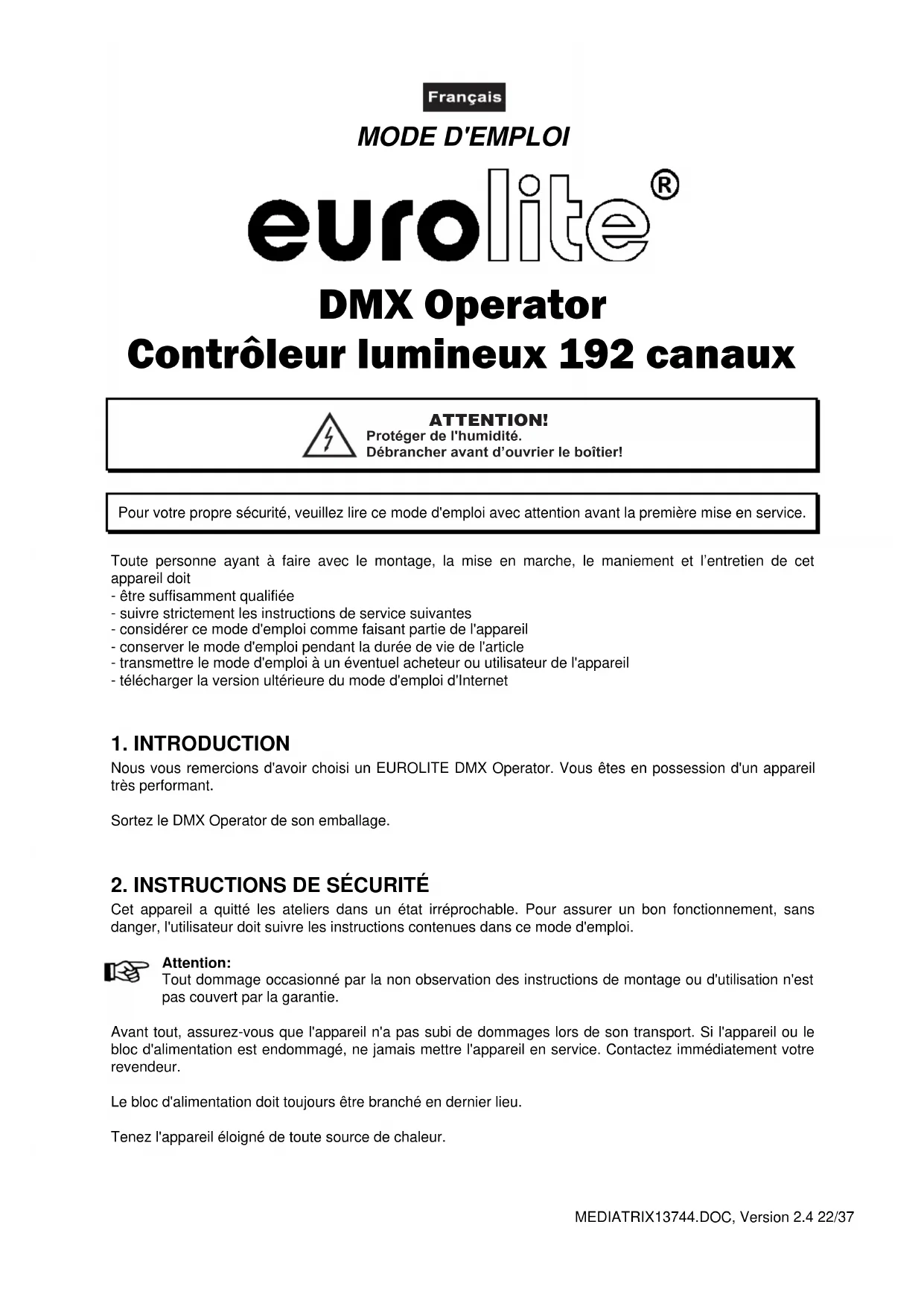 MODE D'EMPLOI DMX Operator 192 Eurolite