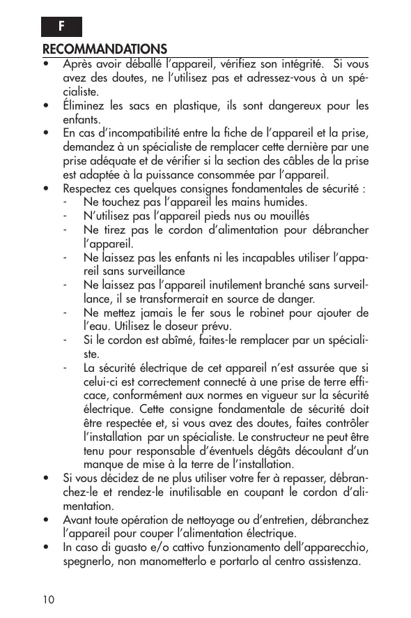 Après avoir déballé l’appareil, vérifiez son intégrité. Si vous avez des doutes, ne l’utilisez pas et adressez-vous à un spécialiste. Éliminez les sacs en plastique, ils sont dangereux pour les enfants. En cas d’incompatibilité entre la fiche de l’appareil et la prise, demandez à un spécialiste de remplacer cette dernière par une prise adéquate et de vérifier si la section des câbles de la prise est adaptée à la puissance consommée par l’appareil. Respectez ces quelques consignes fondamentales de sécurité : - Ne touchez pas l’appareil les mains humides. - N’utilisez pas l’appareil pieds nus ou mouillés - Ne tirez pas le cordon d’alimentation pour débrancher l’appareil. - Ne laissez pas les enfants ni les incapables utiliser l’appareil sans surveillance - Ne laissez pas l’appareil inutilement branché sans surveillance, il se transformerait en source de danger. - Ne mettez jamais le fer sous le robinet pour ajouter de l’eau. Utilisez le doseur prévu. - Si le cordon est abîmé, faites-le remplacer par un spécialiste. - La sécurité électrique de cet appareil n’est assurée que si celui-ci est correctement connecté à une prise de terre efficace, conformément aux normes en vigueur sur la sécurité électrique. Cette consigne fondamentale de sécurité doit être respectée et, si vous avez des doutes, faites contrôler l’installation par un spécialiste. Le constructeur ne peut être tenu pour responsable d’éventuels dégâts découlant d’un manque de mise à la terre de l’installation. Si vous décidez de ne plus utiliser votre fer à repasser, débranchez-le et rendez-le inutilisable en coupant le cordon d’alimentation. Avant toute opération de nettoyage ou d’entretien, débranchez l’appareil pour couper l’alimentation électrique. In caso di guasto e/o cattivo funzionamento dell’apparecchio, spegnerlo, non manometterlo e portarlo al centro assistenza.