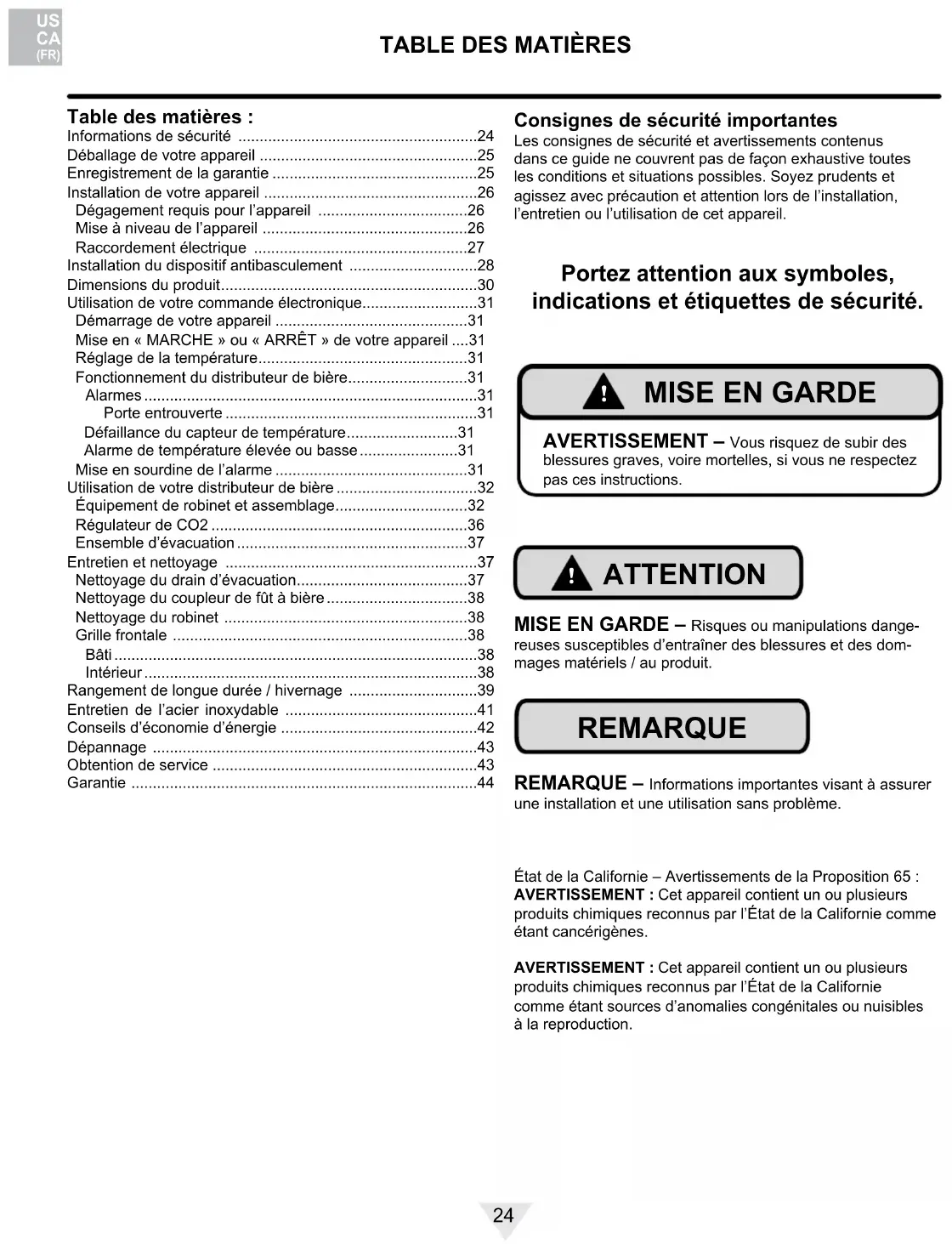 Ce distributeur de bière peut fonctionner avec un baril de format ⁄2 ou ⁄4. La colonne de tirage double peut fonctionner avec deux barils de bière de format ⁄6. Consultez le tableau ci-dessous pour connaître la quantité de bière contenue dans chaque format de baril.Tableau A Format de fût Nombre de fûts par Réservoir de 5 livres de CO2 « Corny » 5 gallons 15 à 22 Baril 1/6 14 à 21 Baril 1/4 10 à 14 Baril 1/2 5 à 7 Le CO2 peut être dangereux. En cas de difculté à respirer et/ou de maux de tête, il peut y avoir une concentration élevée de dioxyde de carbone. Quittez immédiatement la pièce.• Le réservoir de CO2 doit toujours être raccordé au régulateur. Ne jamais raccorder le réservoir au fût.• Le réservoir de CO2 doit être xé solidement en position verticale. Utiliser la chaîne fournie pour le xer.• Ne jamais faire tomber ou projeter le réservoir de CO2.• Conserver le réservoir de CO2 à l’écart de la chaleur.• Aérer la pièce après une fuite de CO2.