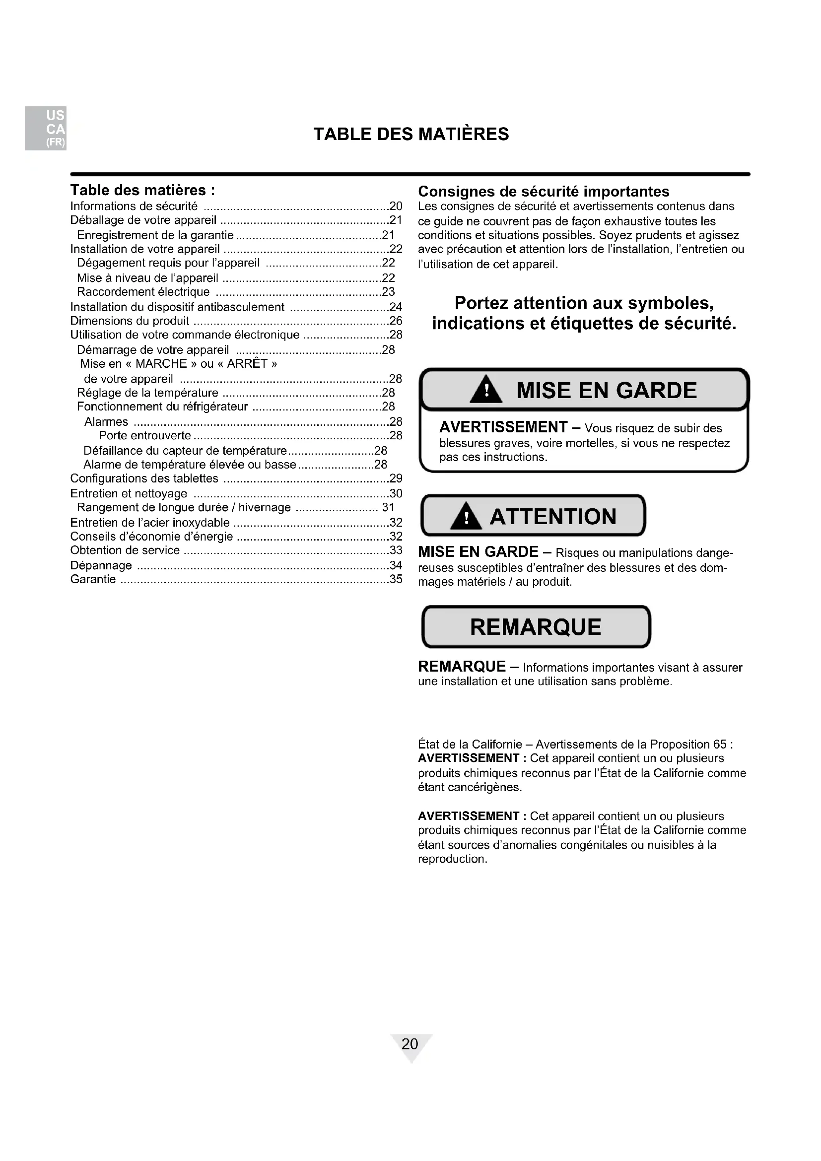 AVERTISSEMENT – Vous risquez de subir des blessures graves, voire mortelles, si vous ne respectez pas ces instructions.MISE EN GARDE – Risques ou manipulations dange-reuses susceptibles d’entraîner des blessures et des dom-mages matériels / au produit.REMARQUE – Informations importantes visant à assurer une installation et une utilisation sans problème.État de la Californie – Avertissements de la Proposition 65 :AVERTISSEMENT : Cet appareil contient un ou plusieurs produits chimiques reconnus par l’État de la Californie comme étant cancérigènes.AVERTISSEMENT : Cet appareil contient un ou plusieurs produits chimiques reconnus par l’État de la Californie comme étant sources d’anomalies congénitales ou nuisibles à la reproduction.21