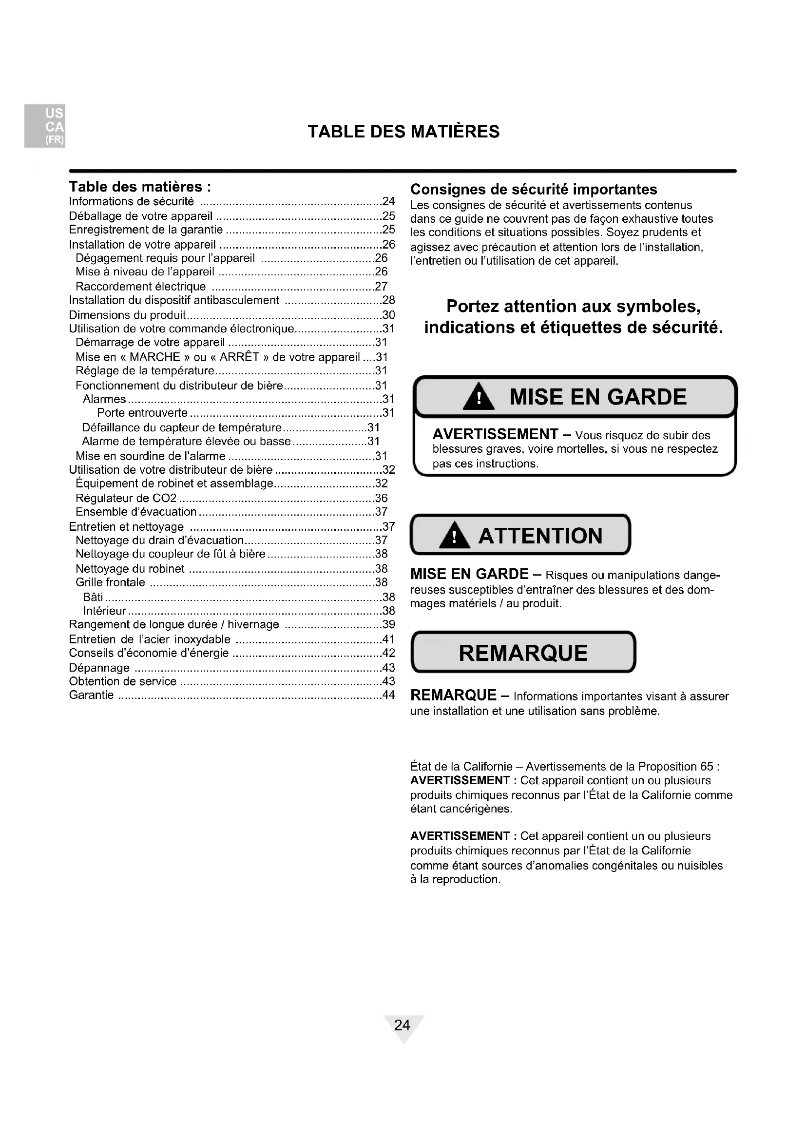 Ce distributeur de bière peut fonctionner avec un baril de format ⁄2 ou ⁄4. La colonne de tirage double peut fonctionner avec deux barils de bière de format ⁄6. Consultez le tableau ci-dessous pour connaître la quantité de bière contenue dans chaque format de baril.Tableau A Format de fût Nombre de fûts par Réservoir de 5 livres de CO2 « Corny » 5 gallons 15 à 22 Baril 1/6 14 à 21 Baril 1/4 10 à 14 Baril 1/2 5 à 7 Le CO2 peut être dangereux. En cas de difculté à respirer et/ou de maux de tête, il peut y avoir une concentration élevée de dioxyde de carbone. Quittez immédiatement la pièce.• Le réservoir de CO2 doit toujours être raccordé au régulateur. Ne jamais raccorder le réservoir au fût.• Le réservoir de CO2 doit être xé solidement en position verticale. Utiliser la chaîne fournie pour le xer.• Ne jamais faire tomber ou projeter le réservoir de CO2.• Conserver le réservoir de CO2 à l’écart de la chaleur.• Aérer la pièce après une fuite de CO2.