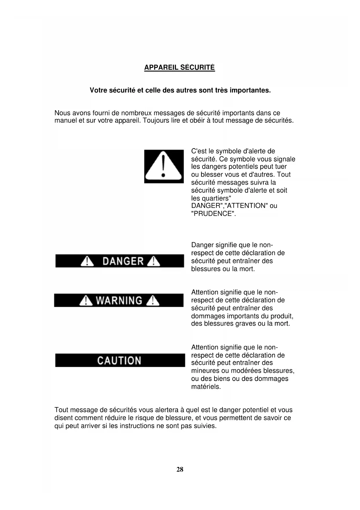 Tout message de sécurités vous alertera à quel est le danger potentiel et vous disent comment réduire le risque de blessure, et vous permettent de savoir ce qui peut arriver si les instructions ne sont pas suivies.29
