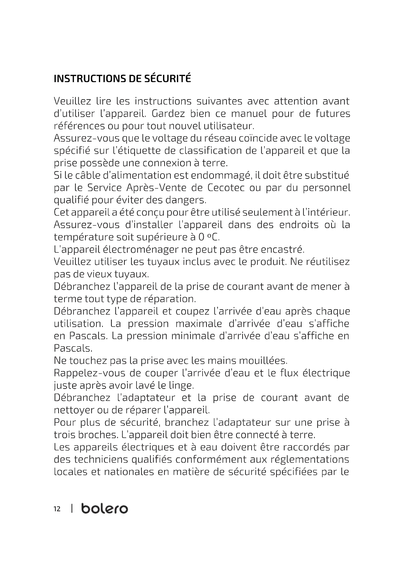 Veuillez lire les instructions suivantes avec attention avant d’utiliser l’appareil. Gardez bien ce manuel pour de futures références ou pour tout nouvel utilisateur. Assurez-vous que le voltage du réseau coïncide avec le voltage spécifié sur l’étiquette de classification de l’appareil et que la prise possède une connexion à terre. Si le câble d’alimentation est endommagé, il doit être substitué par le Service Après-Vente de Cecotec ou par du personnel qualifié pour éviter des dangers. Cet appareil a été conçu pour être utilisé seulement à l’intérieur. Assurez-vous d’installer l’appareil dans des endroits où la température soit supérieure à 0 ºC. L’appareil électroménager ne peut pas être encastré. Veuillez utiliser les tuyaux inclus avec le produit. Ne réutilisez pas de vieux tuyaux. Débranchez l’appareil de la prise de courant avant de mener à terme tout type de réparation. Débranchez l’appareil et coupez l’arrivée d’eau après chaque utilisation. La pression maximale d’arrivée d’eau s’affiche en Pascals. La pression minimale d’arrivée d’eau s’affiche en Pascals. Ne touchez pas la prise avec les mains mouillées. Rappelez-vous de couper l’arrivée d’eau et le flux électrique juste après avoir lavé le linge. Débranchez l’adaptateur et la prise de courant avant de nettoyer ou de réparer l’appareil. Pour plus de sécurité, branchez l’adaptateur sur une prise à trois broches. L’appareil doit bien être connecté à terre. Les appareils électriques et à eau doivent être raccordés par des techniciens qualifiés conformément aux réglementations locales et nationales en matière de sécurité spécifiées par le IM 02317 02322 02327 02332 02319 02324 02328 02333 Lavadora Bolero DressCode_IC_YV_02210311.indd 12IM 02317 02322 02327 02332 02319 02324 02328 02333 Lavadora Bolero DressCode_IC_YV_02210311.indd 12 11/3/21 17:2411/3/21 17:2413 DRESSCODE 7200 / 8200 / 9200 / 10200 INVERTER