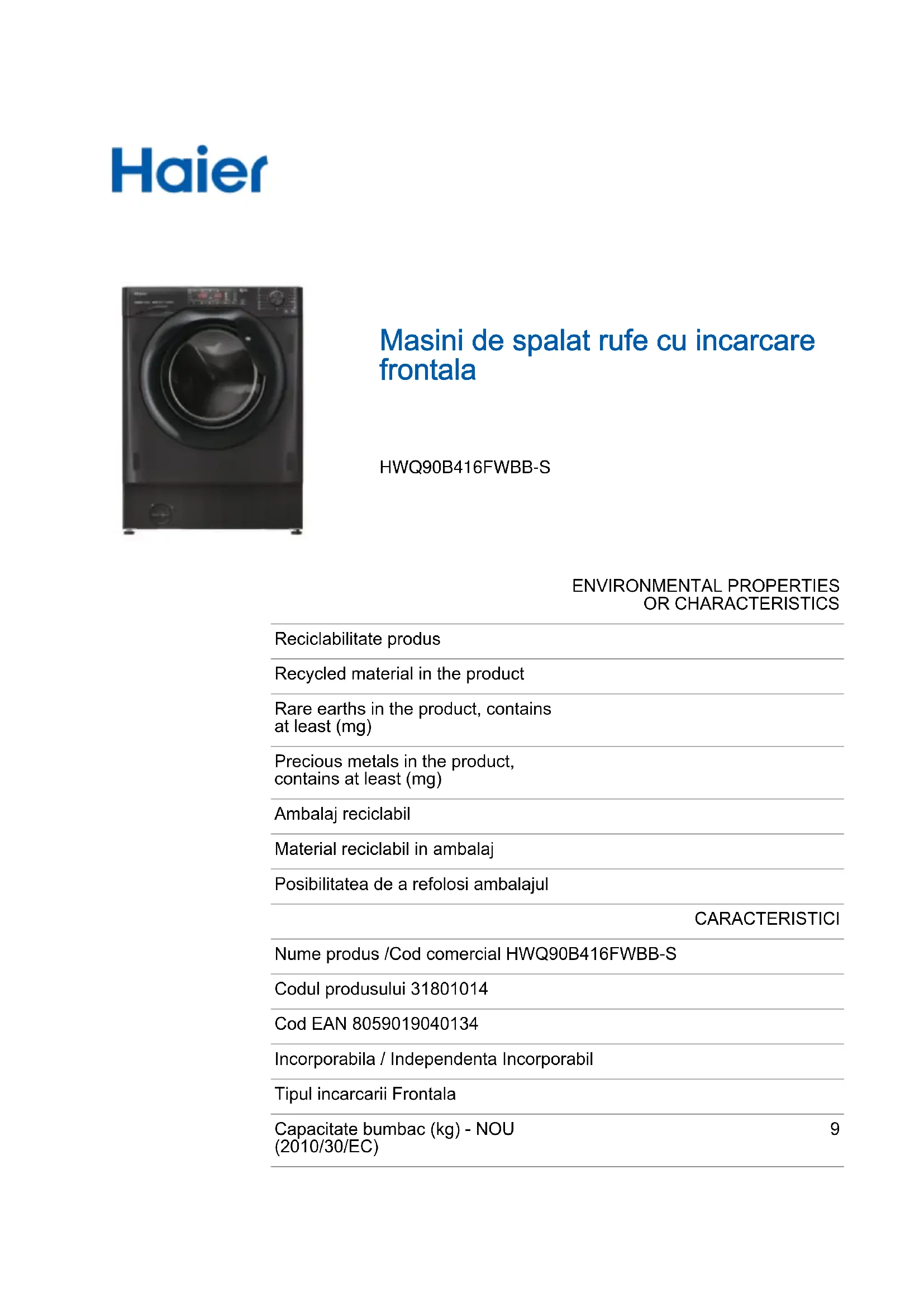 HWQ90B416FWBB - Machine à laver HAIER - Notice d'utilisation et mode d'emploi gratuit