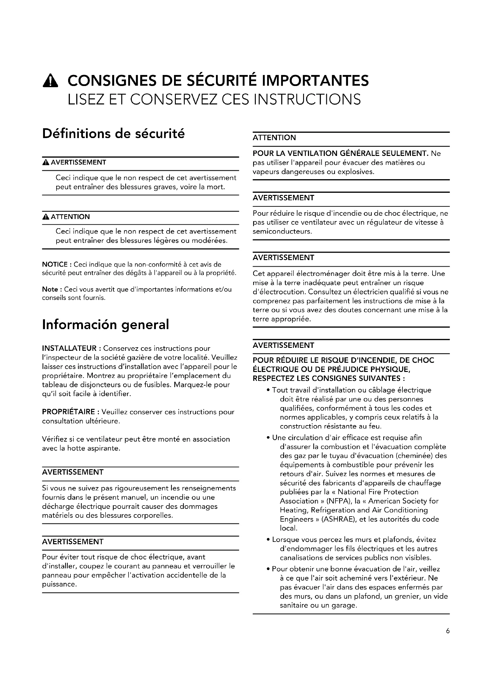 Définitions de sécurité 9 AVERTISSEMENT Ceci indique que le non respect de cet avertissement peut entraîner des blessures graves, voire la mort. 9 ATTENTION Ceci indique que le non respect de cet avertissement peut entraîner des blessures légères ou modérées. NOTICE : Ceci indique que la non-conformité à cet avis de sécurité peut entraîner des dégâts à l'appareil ou à la propriété. Note : Ceci vous avertit que d'importantes informations et/ou conseils sont fournis. Información general INSTALLATEUR : Conservez ces instructions pour l’inspecteur de la société gazière de votre localité. Veuillez laisser ces instructions d’installation avec l’appareil pour le propriétaire. Montrez au propriétaire l’emplacement du tableau de disjoncteurs ou de fusibles. Marquez-le pour qu’il soit facile à identifier. PROPRIÉTAIRE : Veuillez conserver ces instructions pour consultation ultérieure. Vérifiez si ce ventilateur peut être monté en association avec la hotte aspirante. AVERTISSEMENT Si vous ne suivez pas rigoureusement les renseignements fournis dans le présent manuel, un incendie ou une décharge électrique pourrait causer des dommages matériels ou des blessures corporelles. AVERTISSEMENT Pour éviter tout risque de choc électrique, avant d'installer, coupez le courant au panneau et verrouiller le panneau pour empêcher l'activation accidentelle de la puissance. ATTENTION POUR LA VENTILATION GÉNÉRALE SEULEMENT. Ne pas utiliser l'appareil pour évacuer des matières ou vapeurs dangereuses ou explosives. AVERTISSEMENT Pour réduire le risque d'incendie ou de choc électrique, ne pas utiliser ce ventilateur avec un régulateur de vitesse à semiconducteurs. AVERTISSEMENT Cet appareil électroménager doit être mis à la terre. Une mise à la terre inadéquate peut entraîner un risque d'électrocution. Consultez un électricien qualifié si vous ne comprenez pas parfaitement les instructions de mise à la terre ou si vous avez des doutes concernant une mise à la terre appropriée. AVERTISSEMENT POUR RÉDUIRE LE RISQUE D'INCENDIE, DE CHOC ÉLECTRIQUE OU DE PRÉJUDICE PHYSIQUE, RESPECTEZ LES CONSIGNES SUIVANTES :