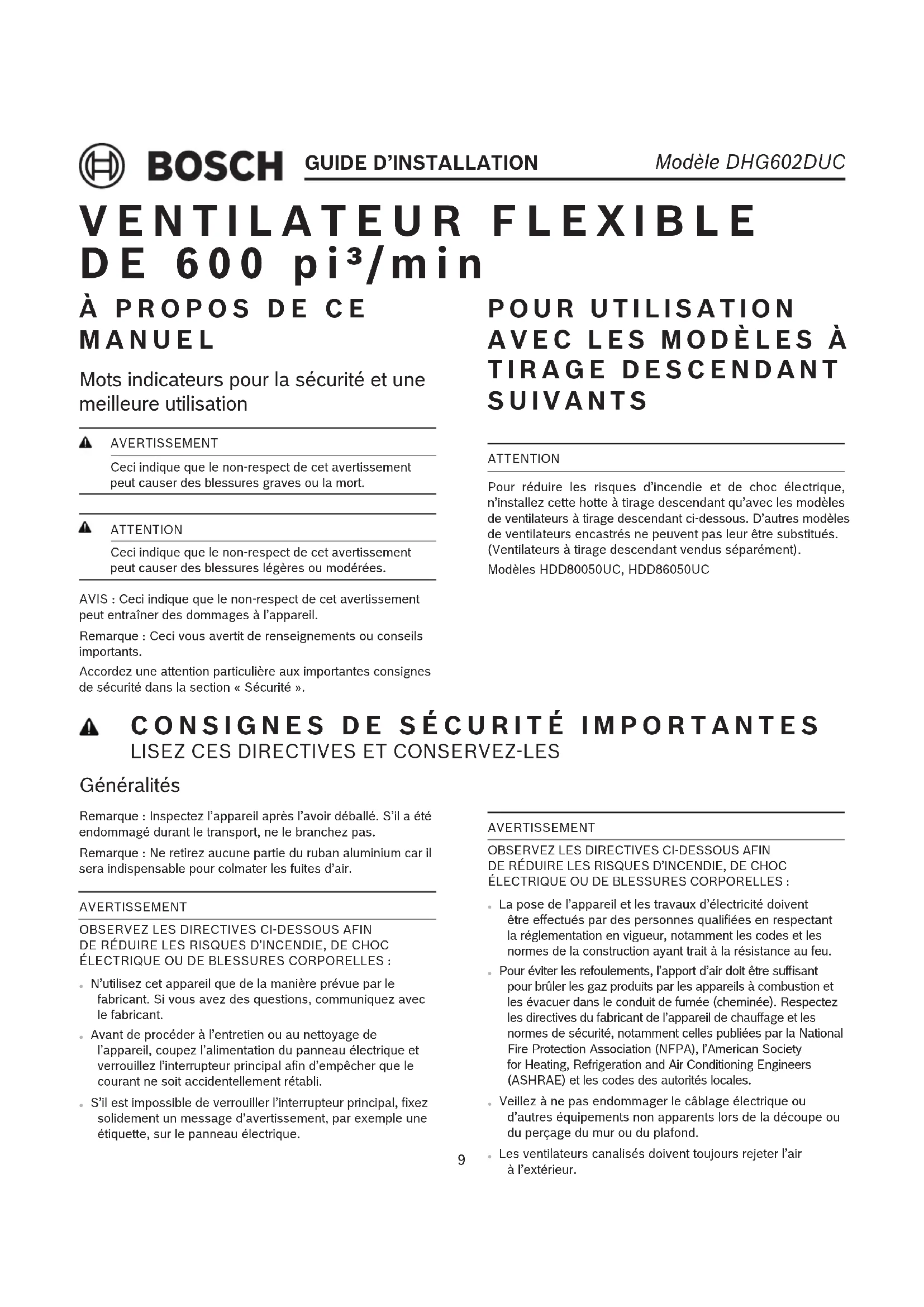 Les ventilateurs canalisés doivent toujours rejeter l’air à l’extérieur. ATTENTION Pour réduire les risques d’incendie et de choc électrique, n’installez cette hotte à tirage descendant qu’avec les modèles de ventilateurs à tirage descendant ci-dessous. D’autres modèles de ventilateurs encastrés ne peuvent pas leur être substitués. (Ventilateurs à tirage descendant vendus séparément). Modèles HDD80050UC, HDD86050UC POUR UTILISATION