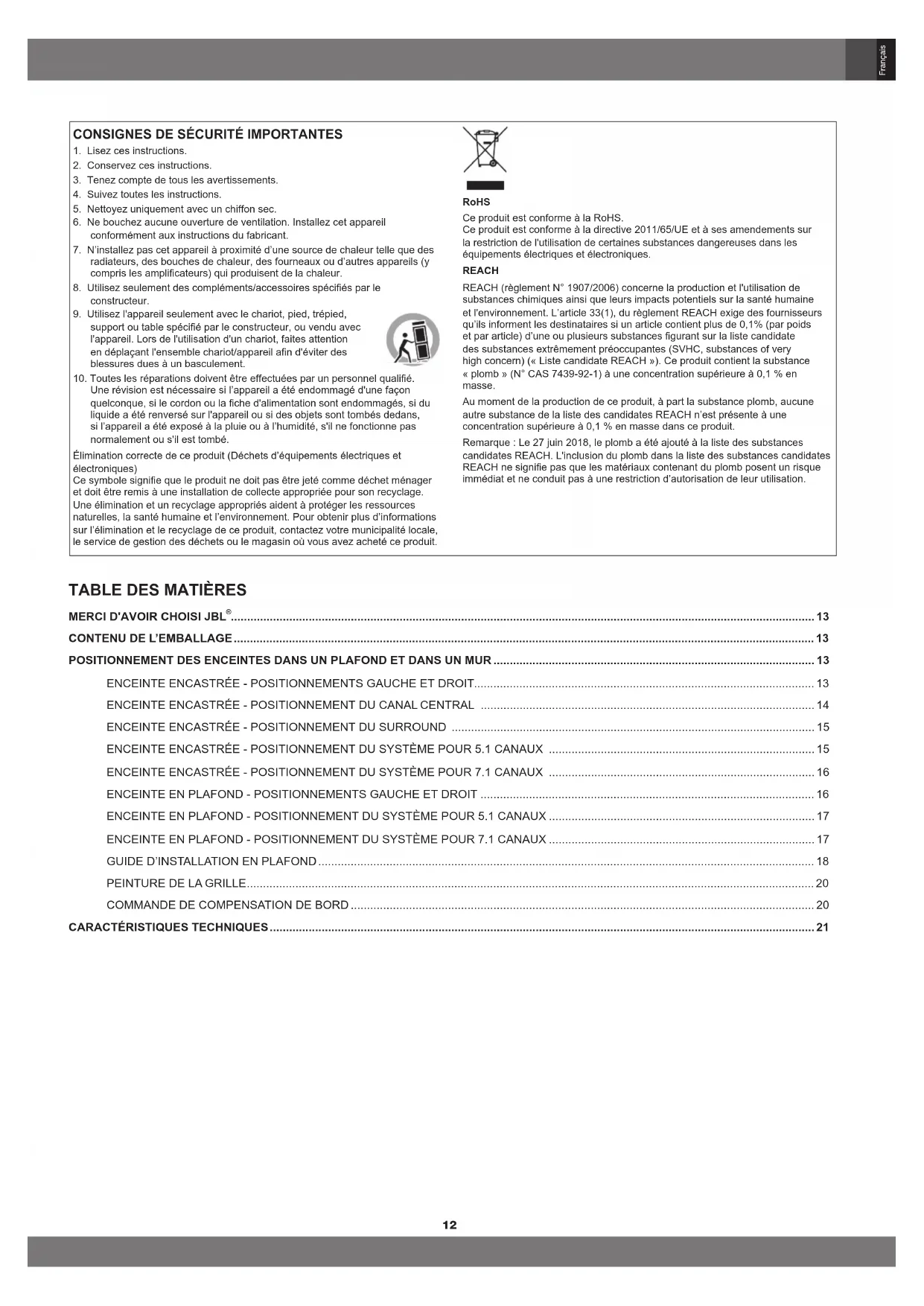 Une révision est nécessaire si l’appareil a été endommagé d'une façon quelconque, si le cordon ou la che d'alimentation sont endommagés, si du liquide a été renversé sur l'appareil ou si des objets sont tombés dedans, si l’appareil a été exposé à la pluie ou à l’humidité, s'il ne fonctionne pas normalement ou s'il est tombé. Élimination correcte de ce produit (Déchets d’équipements électriques et électroniques) Ce symbole signie que le produit ne doit pas être jeté comme déchet ménager et doit être remis à une installation de collecte appropriée pour son recyclage. Une élimination et un recyclage appropriés aident à protéger les ressources naturelles, la santé humaine et l’environnement. Pour obtenir plus d’informations sur l’élimination et le recyclage de ce produit, contactez votre municipalité locale, le service de gestion des déchets ou le magasin où vous avez acheté ce produit. RoHS Ce produit est conforme à la RoHS. Ce produit est conforme à la directive 2011/65/UE et à ses amendements sur la restriction de l'utilisation de certaines substances dangereuses dans les équipements électriques et électroniques. REACH REACH (règlement N° 1907/2006) concerne la production et l'utilisation de substances chimiques ainsi que leurs impacts potentiels sur la santé humaine et l'environnement. L’article 33(1), du règlement REACH exige des fournisseurs qu’ils informent les destinataires si un article contient plus de 0,1% (par poids et par article) d’une ou plusieurs substances gurant sur la liste candidate des substances extrêmement préoccupantes (SVHC, substances of very high concern) (« Liste candidate REACH »). Ce produit contient la substance « plomb » (N° CAS 7439-92-1) à une concentration supérieure à 0,1 % en masse. Au moment de la production de ce produit, à part la substance plomb, aucune autre substance de la liste des candidates REACH n’est présente à une concentration supérieure à 0,1 % en masse dans ce produit. Remarque : Le 27 juin 2018, le plomb a été ajouté à la liste des substances candidates REACH. L'inclusion du plomb dans la liste des substances candidates REACH ne signie pas que les matériaux contenant du plomb posent un risque immédiat et ne conduit pas à une restriction d’autorisation de leur utilisation. TABLE DES MATIèRES